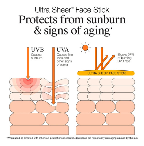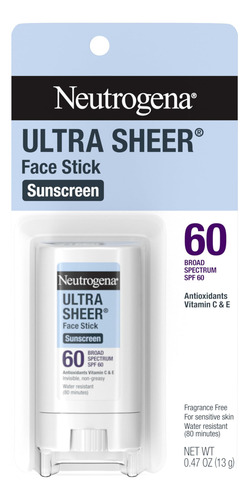 Protetor solar facial Neutrogena Ultra Sheer SPF 60, protetor facial resistente à água com proteção SPF 60 de amplo espectro para peles sensíveis, mini protetor solar de viagem, sem oxibenzona, protetor solar facial Ultra Sheer Neutrogena de 0,47 onças a 0,47 onças com proteção SPF 60 de amplo espectro. Coloque este protetor solar resistente à água de 80 minutos em sua bolsa, com seus suprimentos de praia ou em sua mala de viagem para proteção solar sem bagunça em qualquer lugar — Este protetor solar sem perfume oferece proteção superior de amplo espectro contra os raios UVA do envelhecimento da pele e a queima dos raios UVB e protege a pele com seis camadas de profundidade. O protetor facial leve se espalha facilmente e seca instantaneamente para proteção solar sem bagunça. A fórmula suave do protetor solar não oleoso é ideal para peles sensíveis e é resistente à água por até 80 minutos. O protetor solar facial com tecnologia Helioplex é formulado com os antioxidantes vitamina C e E para ajudar a cuidar da pele – O protetor solar testado por dermatologistas é formulado sem fragrâncias, oxibenzona, parabenos e ftalatos. Ajuda a prevenir queimaduras solares e, se usado conforme indicado por outras medidas de proteção solar, diminui o envelhecimento precoce da pele causado pelo sol. O protetor solar Ultra Sheer Facial Stick da Neutrogena, uma marca recomendada por dermatologistas, seca de forma invisível para ajudar a proteger sua pele sensível do sol. Aplique generosamente e uniformemente 15 minutos antes da exposição ao sol e reaplique a cada duas horas