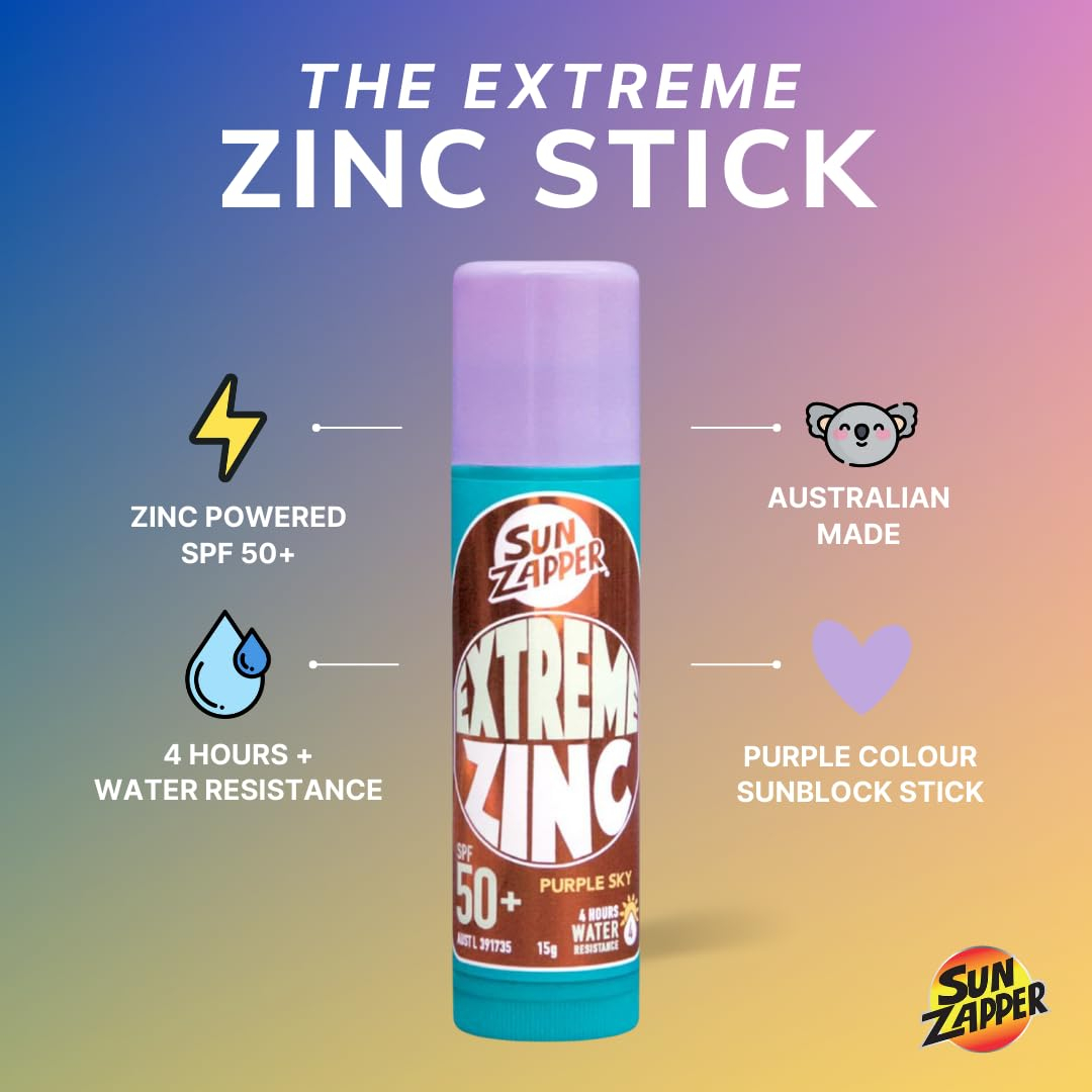 Apresentando o Sun Zapper Extreme Purple Sky Zinc Stick SPF 50+, um protetor solar premium projetado para esfregar uma cor roxa vibrante em sua pele. Destaque-se e pareça uma lenda, ao mesmo tempo em que está protegido. Seja na praia, no campo de críquete ou na piscina, diga não às queimaduras solares com o Sun Zapper. É adequado para todos os tipos de pele e seguro para crianças com mais de 6 meses de idade. Este protetor solar oferece resistência superior à água, permanecendo na água por mais de 4 horas, tornando-o perfeito para todas as suas aventuras aquáticas. Ele fornece uma barreira extrema de elementos, protegendo contra os raios UVA e UVB. Isso faz com que nossos protetores solares à base de zinco sejam alguns dos produtos de proteção solar mais eficazes do mercado. É perfeito para peles sensíveis e com melasma. O Sun Zapper Extreme Purple Sky Zinc Stick é novo para o verão de 2023 e vem em um tamanho maior de 15g, oferecendo cobertura estendida e indo mais longe do que nunca. Ele vem em uma nova e vibrante cor de céu roxo, adicionando um toque de estilo à sua rotina de proteção solar. Este produto é isento de parabenos e fabricado na Austrália, garantindo os mais altos padrões de qualidade. Proteja sua pele com o Sun Zapper Extreme Purple Sky Zinc Stick SPF 50+ e aproveite seu tempo ao sol sem se preocupar! – O bastão de zinco Purple Sky esfregará a cor roxa em sua pele. Destaque-se e pareça uma lenda, ao mesmo tempo em que está protegido. Seja na praia, no campo de críquete ou na piscina, diga não às queimaduras solares com o Sun Zapper – nossa linha Extreme Zinc Stick oferece resistência superior à água e é perfeita para todas as suas aventuras aquáticas. Protetor solar SPF 50+ com mais de 4 horas de resistência à água – O protetor solar de óxido de zinco bloqueia vários tipos de raios (UVA e UVB), tornando os protetores solares à base de zinco alguns dos produtos de proteção solar mais eficazes do mercado. Proteção solar perfeita para pele sensível e melasma — os bastões de zinco Sun Zapper Extreme são novos para o verão de 2023 — oito cores vibrantes e empolgantes. Com um tamanho de tubo maior de 15 g, nosso Extreme Zinc Stick oferece cobertura estendida e vai mais longe do que nunca!