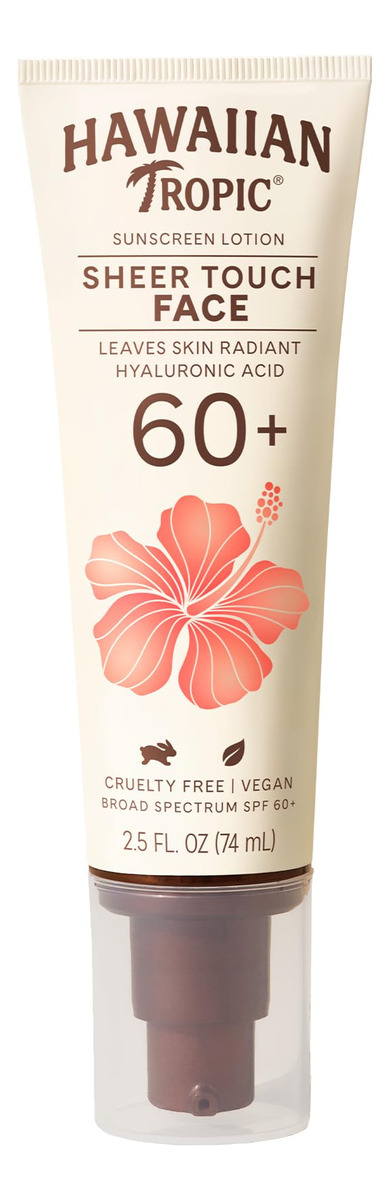 Loção protetora solar facial Hawaiian Tropic Sheer Touch SPF 60, 2,5 onças | Protetor solar para rosto, protetor solar tropical havaiano, protetor solar facial para viagem, protetor solar facial, protetor solar facial, 2,5 onças – O protetor solar de ácido hialurônico fornece 12 horas de hidratação – A proteção UVA e UVB de amplo espectro ajuda a evitar danos causados pelo sol; resistente à água por até 80 minutos – PROTETOR SOLAR ULTRALEVE E NÃO OLEOSO Este protetor solar de absorção rápida A loção protetora combina perfeitamente com todos os tons de pele com um brilho sutil e brilhante — PROTETOR SOLAR DE VIAGEM DE 2,5 onças, protetor solar de viagem com um aroma icônico do trópico havaiano – CUIDADOSAMENTE FORMULADO, livre de crueldade + Protetor solar vegano certificado pela PETA; protetor solar facial SPF testado por dermatologistas que é livre de óleo, parabenos e oxibenzona