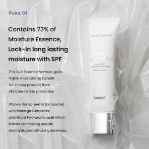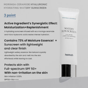 O “Protetor Solar Aquoso de Moringa” proporciona uma sensação macia e hidratada à pele, deixando-a hidratada sem nenhum resíduo visível. Perfeito para pessoas que buscam um protetor solar sem resíduos perceptíveis e um acabamento leve e não oleoso, ele aborda com eficácia os problemas da pele, como ressecamento, pele despojada e sensibilidade. – Efeito hidratante sinérgico: experimente a sinergia natural da ceramida de moringa e do ácido microhialurônico neste protetor solar, proporcionando um poderoso efeito hidratante. Ele hidrata profundamente a pele seca e melhora os níveis de umidade da pele com ceramida de Moringa ecológica. – Um protetor solar refrescante com 73% de essência hidratante para proteção leve e revigorante: o protetor solar tem uma textura hidratante semelhante a um creme que parece leve na pele. Oferece hidratação de longa duração sem deixar manchas ou oleosidade. – Experimente um protetor solar suave que fornece proteção solar eficaz sem picadas ou irritações na pele: este protetor solar tem uma fórmula de essência leve e hidratante que elimina a sensação típica de peso e pegajosidade dos protetores solares tradicionais. – Como usar: aplique uniformemente em áreas propensas à exposição ao sol durante a etapa final de sua rotina de cuidados com a pele. – Marca heimish: concentra-se principalmente na maquiagem tons neutros adequados para uso diário. A gama de cores e as embalagens atraentes da marca atraem a mulher moderna que deseja uma aparência refrescante e natural. Todos os produtos heimish são livres de crueldade, feitos sem parabenos e fabricados na Coréia.