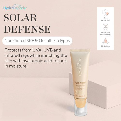 Protetor solar facial HydroPeptide Solar Defense, SPF 50 de amplo espectro, não colorido, rico em antioxidantes e hidratante, seguro para recifes, 1,7 onças — PROTEGE SUA PELE: dos danos causados pelo sol e fornece um aumento de umidade com este protetor solar hidratante incolor SPF 50 — ÚNICO: uma mistura de extratos de calêndula, pepino e açaí fornece uma fonte rica de antioxidantes para nutrir e aliviar a pele dos danos dos radicais livres – AMPLO ESPECTRO: Protetor solar mineral sem adição de fragrância. Protege contra os raios UVA, UVB e infravermelho, enriquecendo a pele com ácido hialurônico que retém a umidade e alantoína e camomila para acalmar – REEF-SAFE: a fórmula com ácido hialurônico condiciona e nutre a pele. Desenvolvido por um geneticista e formulado sem: glúten, parabenos, ftalatos ou sulfatos. Livre de crueldade – AT HYDROPEPTIDE: usamos a ciência epigenética, o poder dos peptídeos, além de nossa experiência sensorial para formular produtos luxuosos para a pele voltados para resultados que fazem você parecer e se sentir incrível por dentro e por fora