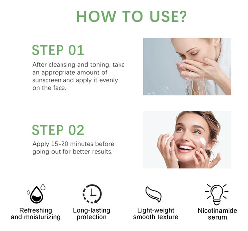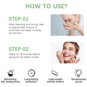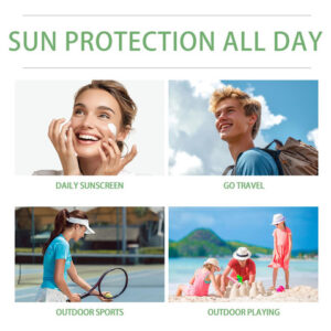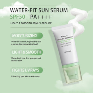 Nome do produto: Protetor solar SPF 50+ PA++++ Qualidade do produto: 50ML/1,69FL.OZ Prazo de validade: 3 anos CARACTERÍSTICAS: 1. Proteção SPF 50 poderosa. Nosso protetor solar spf 50 é feito com extratos de Centella Asiatica para proteger sua pele enquanto a mantém hidratada e nutrida. 2. Fórmula leve e não oleosa Nosso protetor solar SPF 50 tem uma textura leve que é facilmente absorvida pela pele, sem deixar resíduos e proporciona uma sensação confortável. 3. De longa duração, resistente à água Nosso hidratante facial spf 50 oferece proteção durante todo o dia, mesmo durante atividades ao ar livre, como nadar e suar. 4. Adequado para todos os tipos de pele Nosso protetor solar coreano é suave o suficiente para peles sensíveis, fornecendo proteção solar eficaz e reduzindo o ressecamento. Dicas: Somente para uso externo. Se houver vermelhidão ou reação alérgica, pare de usá-lo imediatamente. Por favor, mantenha-o longe das crianças. Armazene em um local fresco e com sombra. – Hidratante – Sérum solar – Este protetor solar SPF 50 para rosto é rico em essência hidratante pura de Centella Asiatica para nutrir e suavizar a pele, proteger a pele em atividades ao ar livre e manter a nutrição ao mesmo tempo. – Fórmula leve. Nosso protetor solar facial tem uma textura leve composta por ingredientes vegetais, que ajuda a hidratar, suavizar e hidratar, além de proteger a pele! Oferece uma poderosa proteção SPF 50+ PA++++, além de ajudar a manter a pele úmida em vez de descascar. – Hidratação duradoura Nosso sérum solar Water Fit é rico em ingredientes vegetais, com textura leve e rápida absorção da pele, promovendo a hidratação da pele e garantindo que a pele permaneça hidratada. Adequado para todos os tipos de pele para uso diário. – Sem brilho branco, não pegajoso, sem oleosidade. Com uma textura leve, este protetor solar não deixa óleo e é adequado para todas as estações e ao ar livre. Nosso hidratante facial com protetor solar. Como etapa final no cuidado diário da pele, use-o antes de aplicar a maquiagem. – Design de material conveniente Projetado com um dispensador de bomba e uma embalagem compacta. Sinta a textura leve em forma de gel com a ponta dos dedos. Faz com que a pele fique tão úmida quanto se estivesse encharcada de água. Hidratante facial com protetor solar, essencial para viagens, para entusiastas de atividades ao ar livre