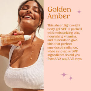 Um protetor solar SPF 30 leve e de amplo espectro, repleto de óleos hidratantes, vitaminas nutritivas e minerais perolados de âmbar dourado de origem ética para dar à pele o brilho perfeito ao sol, enquanto ingredientes inovadores de SPF protegem você dos raios UVA e UVB. – BODY GLOW: Diga olá à sua nova melhor amiga da pele! Este gel SPF oferece um brilho natural e ensolarado, perfeito para qualquer estação do ano. Quer você esteja na praia ou se preparando para uma festa, é o toque final definitivo para uma pele radiante e protegida que rouba os holofotes. – PROTEÇÃO DA PELE: Prepare-se para brilhar! Esta fórmula leve absorve rapidamente, sem deixar nenhuma sensação pegajosa ou oleosa. Desfrute da combinação perfeita de proteção solar, hidratação e um toque de brilho que deixará sua pele radiante e pronta para brilhar. – NUTRITIVO: trate sua pele com óleos de macadâmia e hibisco que acalmam a irritação UV enquanto protegem e reparam. A vitamina E mantém você livre de estresse, e a mica de origem ética adiciona um brilho dourado rosa que fará você brilhar como nunca antes. – PERFUME PRAIANO: mergulhe no paraíso com nosso aroma exclusivo de leite de coco doce. É como férias tropicais em uma garrafa! Perfeito para adicionar um pouco de felicidade praiana ao seu dia, não importa onde você esteja. – COMO APLICAR: Aplique uniformemente 15 minutos antes do sol! Reaplique após 40 minutos nadando, suando ou secando com uma toalha, porque seu brilho merece um pouco mais de amor para continuar brilhando o dia todo!