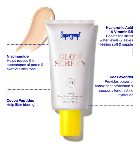 Super goop! Glowscreen SPF 40 – Primer protetor solar brilhante com ácido hialurônico, vitamina B5 e niacinamida – 1,7 onças – PROTETOR SOLAR MULTITAREFA – Supergoop. O Glowscreen é um protetor solar de amplo espectro com FPS 40 que ajuda a filtrar a luz azul e funciona como um primer para maquiagem para peles úmidas e brilhantes que não são oleosas ou oleosas. – SUA NOVA fórmula hidratante GLOW-TO – Glowscreen aperfeiçoa a pele, dando-lhe uma dose saudável de perolação e criando uma camada base totalmente úmida para sua aparência. – Boa para brilhar – Com hialina ácido urônico, vitamina B5 e niacinamida, esse protetor solar facial deixa a pele naturalmente macia e úmida de dentro para fora. Um passo e você estará pronto para brilhar. – INGREDIENTES PODEROSOS – Nossa mistura de hidratação ajuda a aumentar a umidade da pele, deixando-a macia e nutrida. A lavanda marinha fornece proteção antioxidante, ao mesmo tempo que promove uma hidratação duradoura. – COMO APLICAR – Aplique generosa e uniformemente como última etapa de sua rotina de cuidados com a pele e antes da maquiagem.