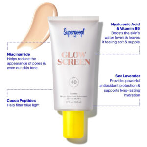 Super goop! Glowscreen SPF 40 – Primer protetor solar brilhante com ácido hialurônico, vitamina B5 e niacinamida – 1,7 onças – PROTETOR SOLAR MULTITAREFA – Supergoop. O Glowscreen é um protetor solar de amplo espectro com FPS 40 que ajuda a filtrar a luz azul e funciona como um primer para maquiagem para peles úmidas e brilhantes que não são oleosas ou oleosas. – SUA NOVA fórmula hidratante GLOW-TO – Glowscreen aperfeiçoa a pele, dando-lhe uma dose saudável de perolação e criando uma camada base totalmente úmida para sua aparência. – Boa para brilhar – Com hialina ácido urônico, vitamina B5 e niacinamida, esse protetor solar facial deixa a pele naturalmente macia e úmida de dentro para fora. Um passo e você estará pronto para brilhar. – INGREDIENTES PODEROSOS – Nossa mistura de hidratação ajuda a aumentar a umidade da pele, deixando-a macia e nutrida. A lavanda marinha fornece proteção antioxidante, ao mesmo tempo que promove uma hidratação duradoura. – COMO APLICAR – Aplique generosa e uniformemente como última etapa de sua rotina de cuidados com a pele e antes da maquiagem.