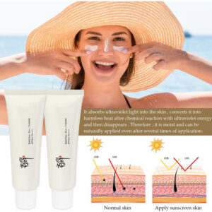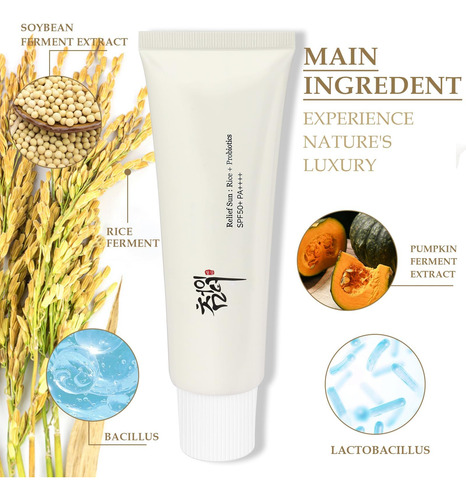 Protetor solar orgânico Relief Sun SPF50, solução coreana para todos os tipos de pele, ++++PA++++ Arroz e probióticos, 50 ml de proteção nutritiva para a pele e proteção UV, protetor solar coreano, protetor solar de centela, protetor solar para meninas negras