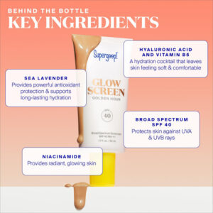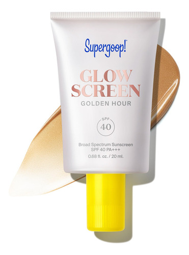 Super goop! Glowscreen Mini, Golden Hour, 0,68 onças – PROTETOR SOLAR MULTITAREFA – Supergoop! Glowscreen é um protetor solar de amplo espectro com SPF 40 que ajuda a filtrar a luz azul e funciona como um primer de maquiagem para peles úmidas e brilhantes que não são gordurosas ou oleosas — e agora vem em quatro tons radiantes! – Sua nova fórmula hidratante GLOW-TO — Glowscreen aperfeiçoa a pele, dando-lhe uma dose saudável de perolação e criando uma camada base totalmente úmida e brilhante para sua aparência, sem brilho ou brilho visível. – Bom de brilhar – Com ácido hialurônico, vitamina B5 e niacinamida, esse protetor solar facial deixa a pele naturalmente macia e úmida de dentro para fora. Um passo e você estará pronto para brilhar. – INGREDIENTES PODEROSOS – Nossa mistura de hidratação ajuda a aumentar a umidade da pele, deixando-a macia e nutrida. A lavanda marinha fornece proteção antioxidante, ao mesmo tempo que promove uma hidratação duradoura. – COMO APLICAR – Aplique generosa e uniformemente como última etapa de sua rotina de cuidados com a pele e antes da maquiagem.