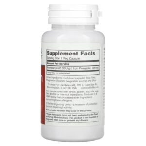 Como funciona: A bromelaína é uma enzima proteolítica (digestão de proteínas) derivada da planta de abacaxi. É funcional em uma ampla faixa de pH e não perde sua atividade ao passar pelo ambiente ácido do estômago. Estudos científicos indicam que a bromelaína é altamente biodisponível e pode ajudar a aliviar a dor transitória normal e o desconforto associado ao uso excessivo ocasional. Este produto contém 500 mg de Bromelaína natural por cápsula e é adequado para vegetarianos.