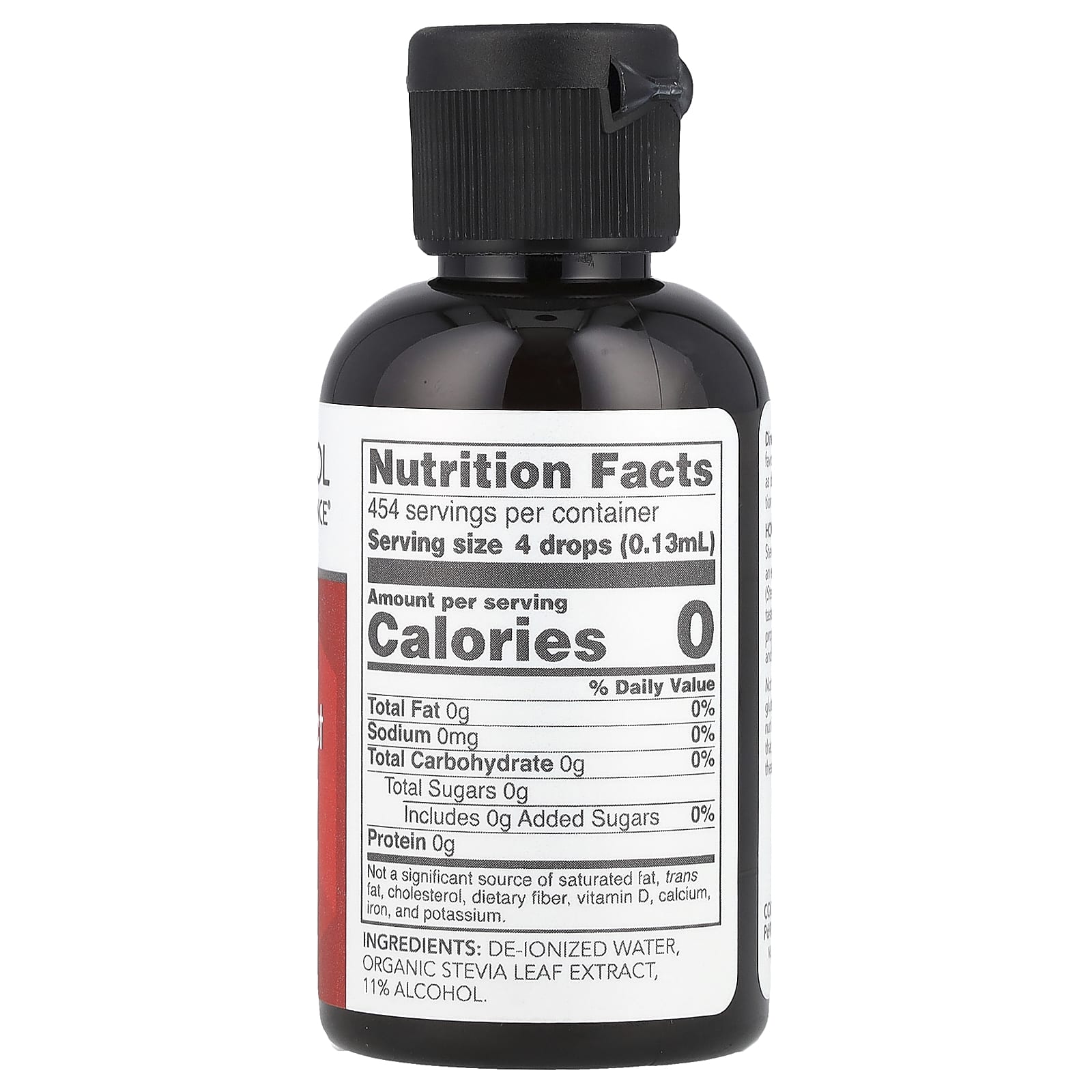Água deionizada, extrato da folha de estévia orgânica, Álcool a 11%.