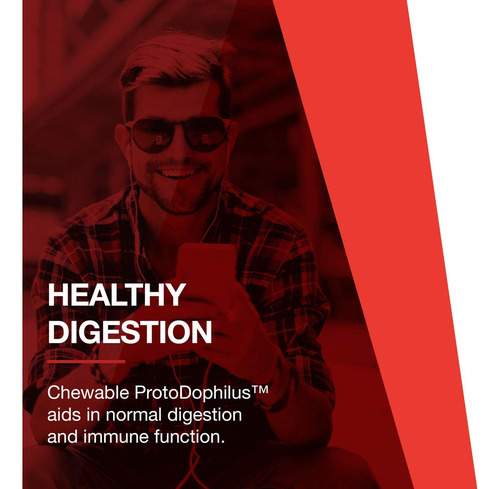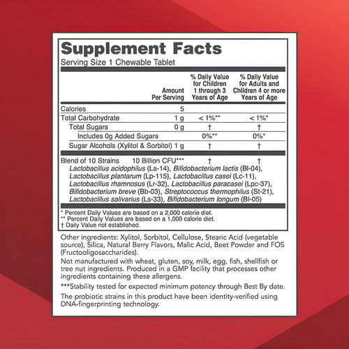 Tamanho da porção: 1 comprimido para mastigar. Ingredientes: Mistura de 10 bilhões de CFU de bactérias probióticas: Lactobacillus acidophilus, Bifidobacterium lactis, Lactobacillus plantarum, Lactobacillus casei, Lactobacillus rhamnosus, Lactobacillus paracasei, Bifidobacterium breve, Streptococcus thermophilus, Lactobacillus Luis salivarius, Bifidobacterium longum. Outros ingredientes: xilitol, sorbitol, celulose, ácido esteárico, sílica, sabores naturais de frutas vermelhas, pó de beterraba.