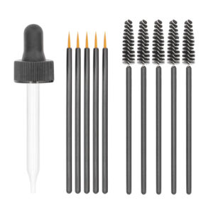 O kit de Óleo de Rícino com Aplicador contém (1) frasco de 1 oz de óleo de rícino orgânico, (1) conta-gotas de vidro, (5) bastões e (5) pincéis para cuidar dos cílios e das sobrancelhas.