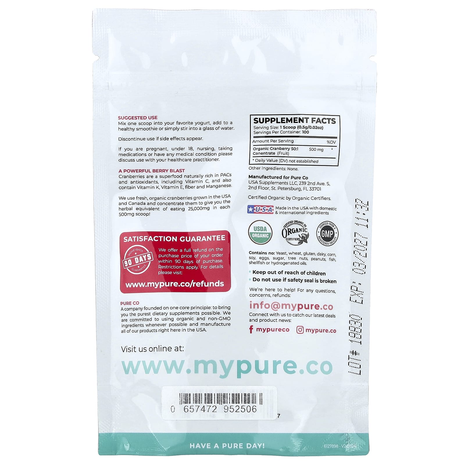 Pure Co. Cranberry Orgânico Concentrado 50 g (176 oz) – Pure Co. Suplementos Ervas Suplementos de Cranberry.