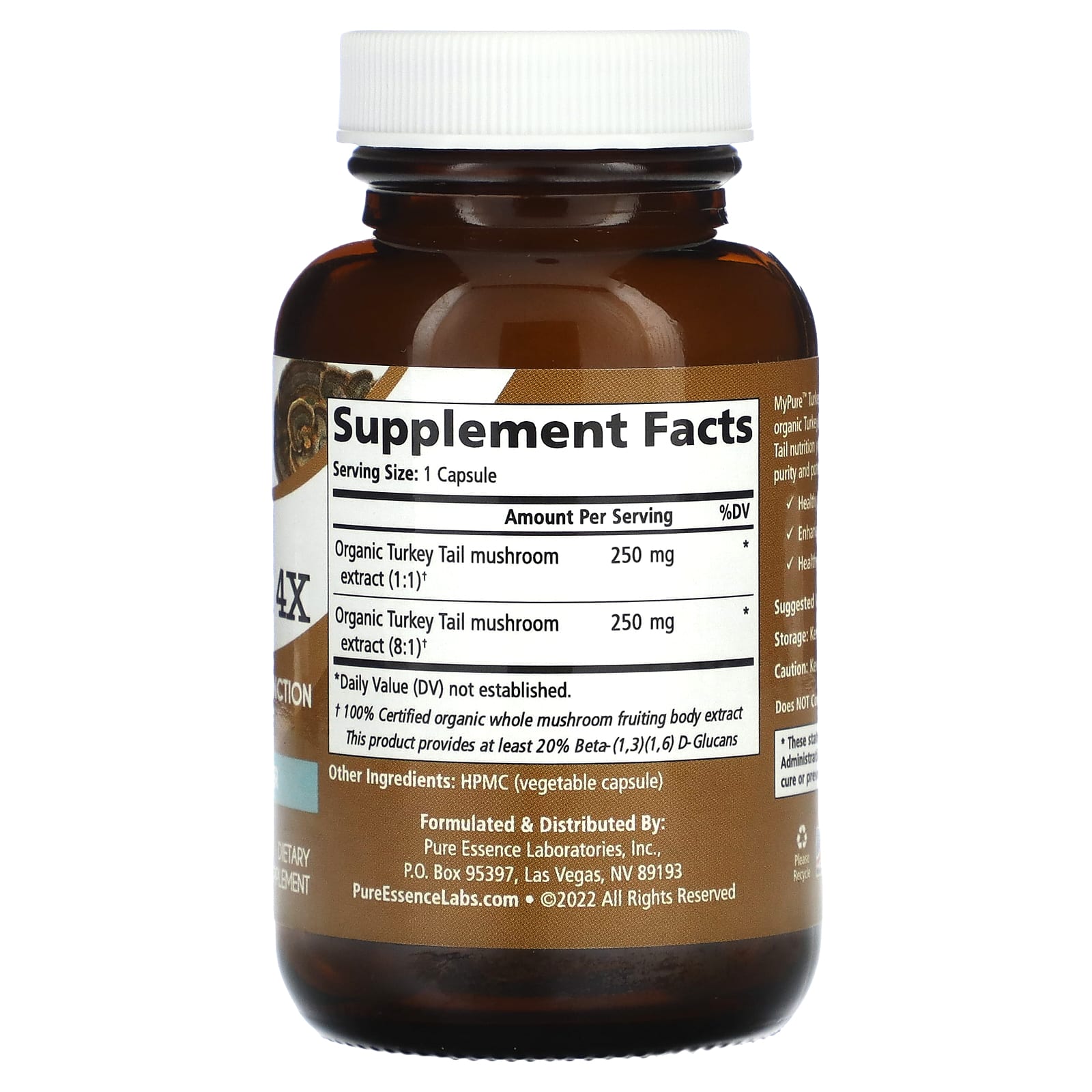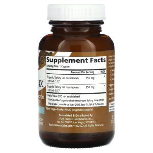 MyPure™ Turkey Tail 4X combina extratos 1:1 e 8:1 de corpos de frutificação de Turkey Tail orgânicos certificados para fornecer a nutrição de Turkey Tail mais potente que você encontrará. Cada lote é testado em laboratório para garantir a limpeza, a pureza e a potência. O Turkey Tail contribui para: