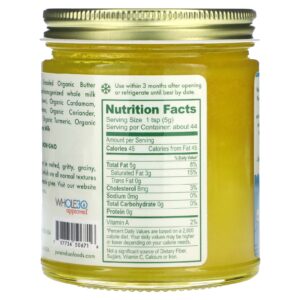 Manteiga orgânica alimentada com pasto (feita com leite integral não homogeneizado de vacas alimentadas com pasto), cardamomo orgânico, canela orgânica, semente de coentro orgânico, cominho orgânico, cúrcuma orgânica, noz-moscada orgânica.