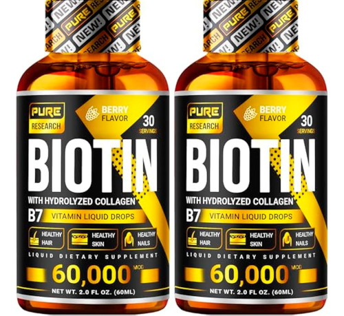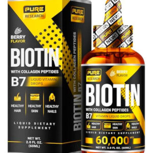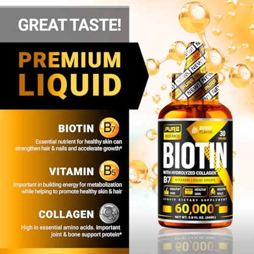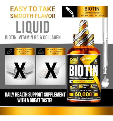 SUPORTE DE ALTA POTÊNCIA PARA CABELO, PELE E UNHAS: Pure Research Liquid Biotin & Collagen contém biotina e colágeno de alta potência para apoiar o crescimento do cabelo, pele saudável e unhas fortes. Cada porção de apenas 1 mL contém 25.000 mcgs. São 10.000 mcg de biotina também conhecida como vitamina B-7 e 15.000 mcg de colágeno suíno hidrolisado tipo I e III.