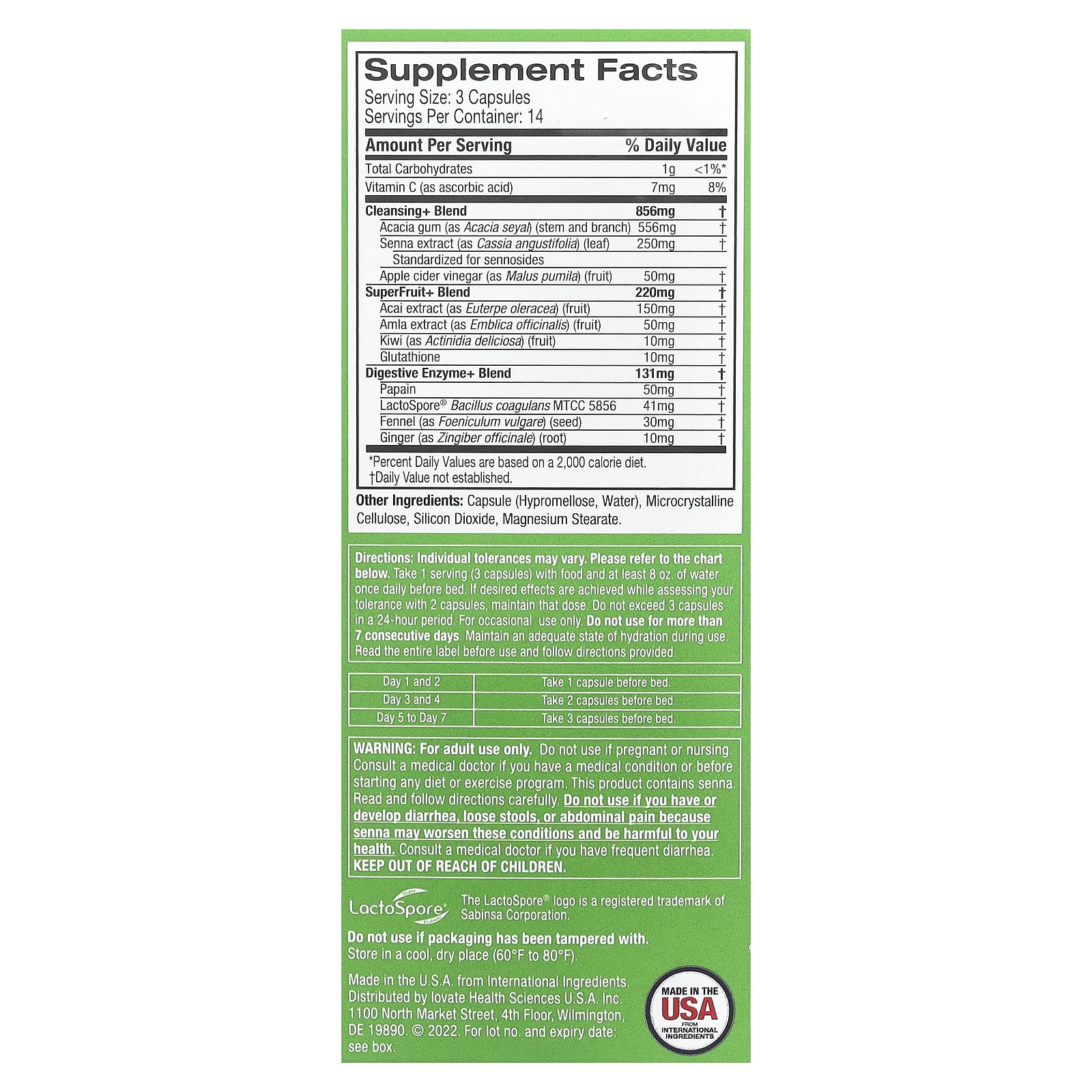 Somente para uso de adultos. Não use se estiver grávida ou amamentando. Consulte um médico se você tiver algum problema de saúde ou antes de iniciar qualquer dieta ou rotina de treino. Este produto contém senna. Leia e siga as instruções cuidadosamente. Não use se você tiver ou desenvolver diarreia, fezes moles ou dor abdominal, porque senna pode piorar esses quadros e ser prejudicial à sua saúde. Consulte um médico se tiver diarreia com frequência. Mantenha fora do alcance de crianças.