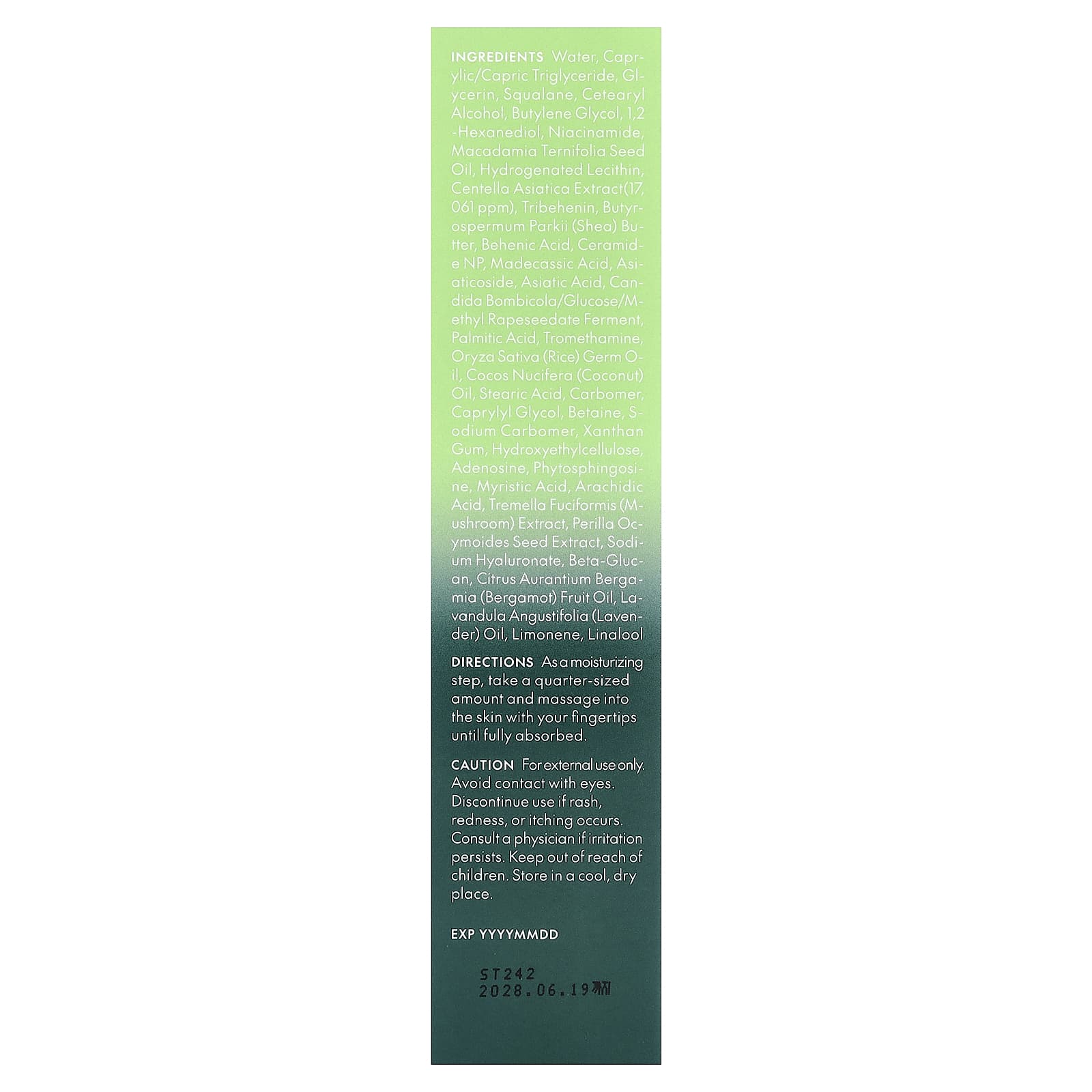 Água, triglicerídeo caprílico/cáprico, Glicerina, esqualano, álcool cetearílico, butilenoglicol, 1,2-hexanediol, Niacinamida, Óleo de semente de macadâmia ternifolia, lecitina hidrogenada, extrato de Centella asiatica (17.061 ppm), tribohenin, Manteiga de Butyrospermum ParkII (Karité), ácido behenico, ceramida np, ácido madecássico, asiaticoside, ácido asiático, fermento de Candida bombicola/glicose/methyl rapeseedate, ácido palmítico, Trometamina, óleo do germe de Oryza sativa (arroz), óleo de Cocos nucifera (coco), ácido esteárico, carbômero, caprilil glicol, betaína, carbômer de sódio, goma xantana, hietelose, adenosina, fitoesfingosina, Ácido mirístico, ácido eicosanoico, extrato de Tremella fuciformis (cogumelo), extrato da semente de Perilla ocymoides, hialuronato de sódio, betaglucano, óleo da fruta de Citrus aurantium bergamia (bergamota), óleo de Lavandula angustifolia (lavanda), limoneno, linalol.