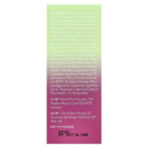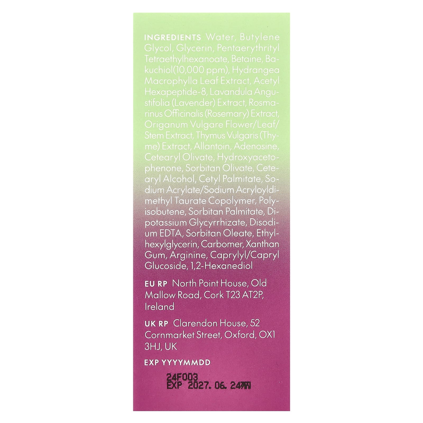 Água, butylene glycol, glicerina, pentaerythrityl tetraethylhexanoate, betaína, bakuchiol (10.000 ppm), extrato da folha de Hortênsia macrophylla, acetyl hexapeptide-8, extrato de Lavandula angustifolia (lavanda), extrato de Rosmarinus officinalis (alecrim), extrato da flor/folha/caule de Origanum vulgare, extrato de Thymus vulgaris (tomilho), alantoína, adenosina, cetearyl olivate, hidroxiaceto fenona, sorbitan olivate, álcool cetoestearílico, palmitato de cetila, sodium acrylate/sodium acryloyldimethyl taurate copolymer, poli-isobutileno, palmitato de sorbitano, dipotassium glycyrrhizate, edetato dissódico, oleato de sorbitana, ethylhexylglycerin, carbômero, goma xantana, arginina, caprylyl/capryl glucoside, 1,2-hexanediol.