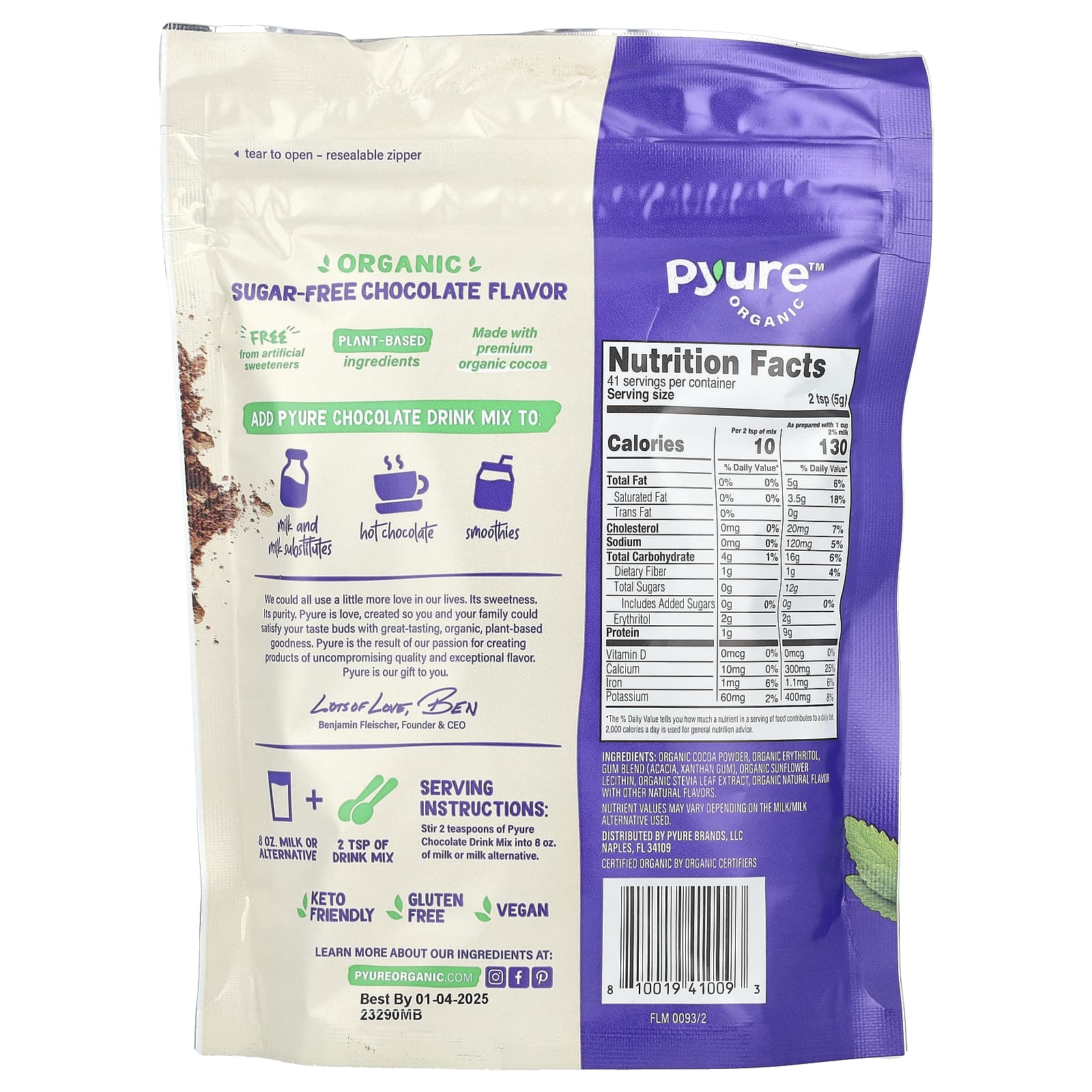 Instruções de porção: Misture 2 colheres de chá da Mistura para Bebida de Chocolate da Pyure em 8 oz. de leite ou de bebida alternativa ao leite.