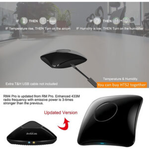 [Versão atualizada] RM4 Pro é atualizado do RM Pro. A frequência de rádio 433M aprimorada com potência emissiva é 3 vezes mais forte do que a anterior. Suporta sensor externo de temperatura e umidade, broadlink hts2 conecta-o ao RM4 pro, BroadLink App mostra a temperatura e umidade do ambiente. (É necessário um cabo USB T&H extra)