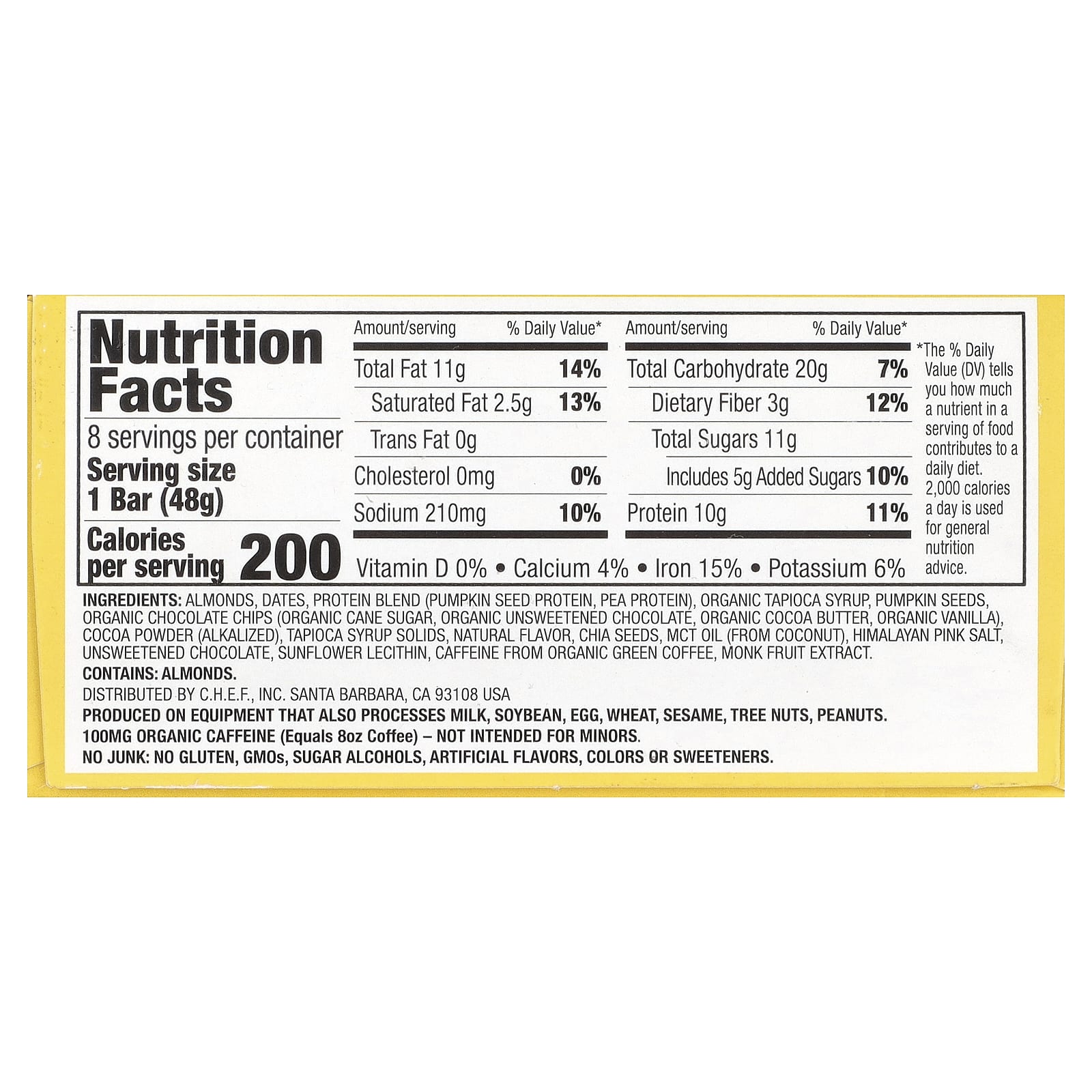 Amêndoas, tâmaras, mistura de proteínas (proteína da semente de abóbora, proteína de ervilha), xarope de tapioca orgânica, sementes de abóbora, gotas de chocolate orgânico (açúcar de cana orgânico, chocolate orgânico sem açúcar, manteiga de cacau orgânico, baunilha orgânica), cacau em pó (alcalinizado), sólidos de xarope de tapioca, sabor natural, sementes de chia, óleo TCM (de coco), sal rosa do Himalaia, chocolate não adoçado, lecitina de girassol, cafeína de café verde orgânico, extrato da fruta-dos-monges.