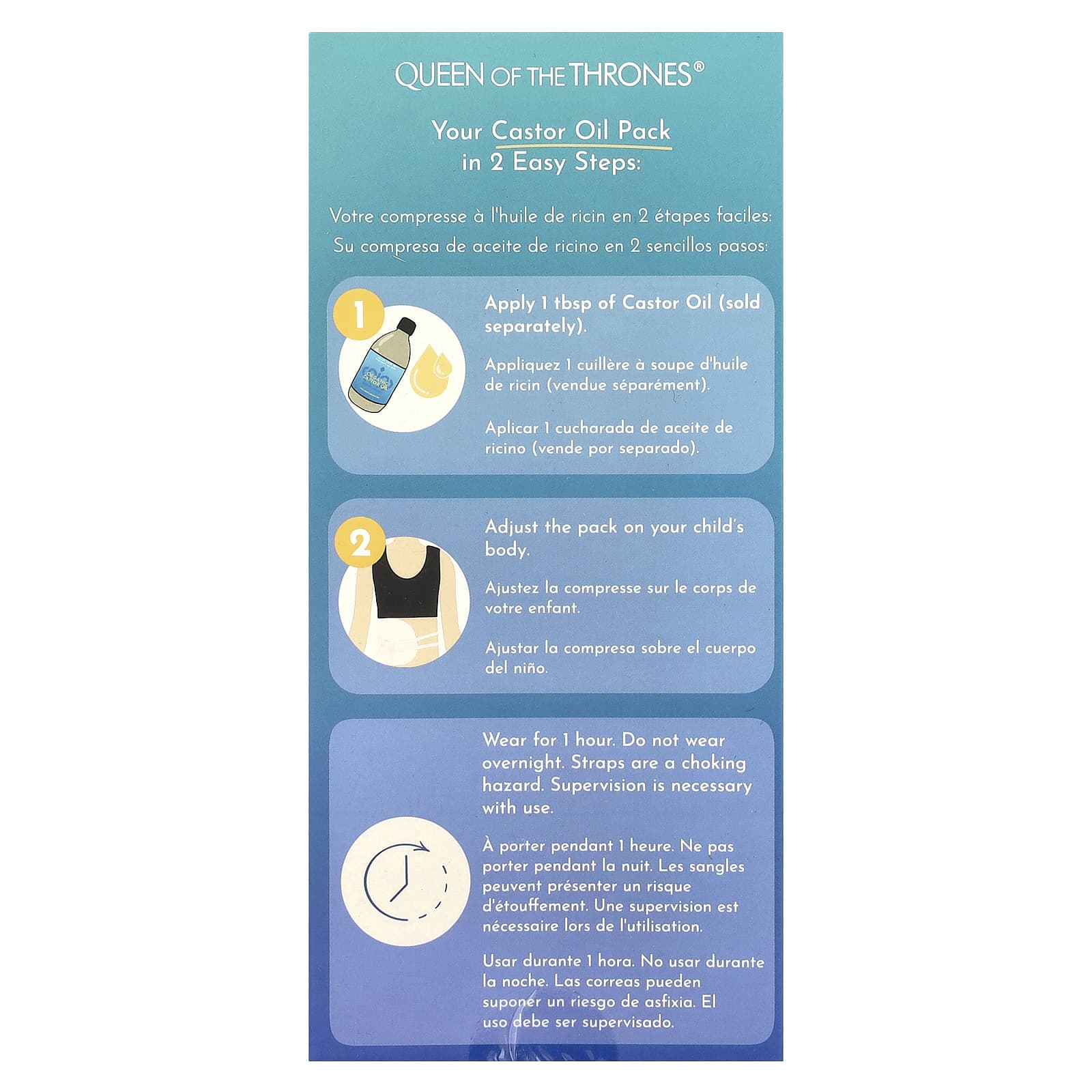 Este pacote de óleo de rícino tem um ciclo de vida natural e descolorirá, deteriorará e ficará saturado com o uso e o tempo. As tiras oferecem risco de asfixia. Mantenha fora do alcance de crianças. Não use se estiver grávida. Sempre consulte seu profissional de saúde para garantir que esta ou qualquer prática de saúde seja adequada para você. Essas declarações não foram avaliadas pela FDA. Este produto não se destina a diagnosticar, tratar, curar ou prevenir qualquer doença.