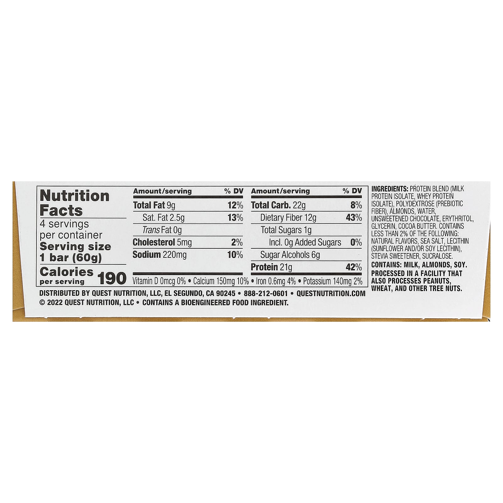 Mistura de proteínas (isolado de proteína do leite, isolado de whey protein), polidextrose (fibra prebiótica), amêndoas, água, chocolate não adoçado, eritritol, glicerina, manteiga de cacau. Contém menos de 2% do seguinte: sabores naturais, sal marinho, lecitina de girassol e/ou lecitina de soja), adoçante de estévia, sucralose.