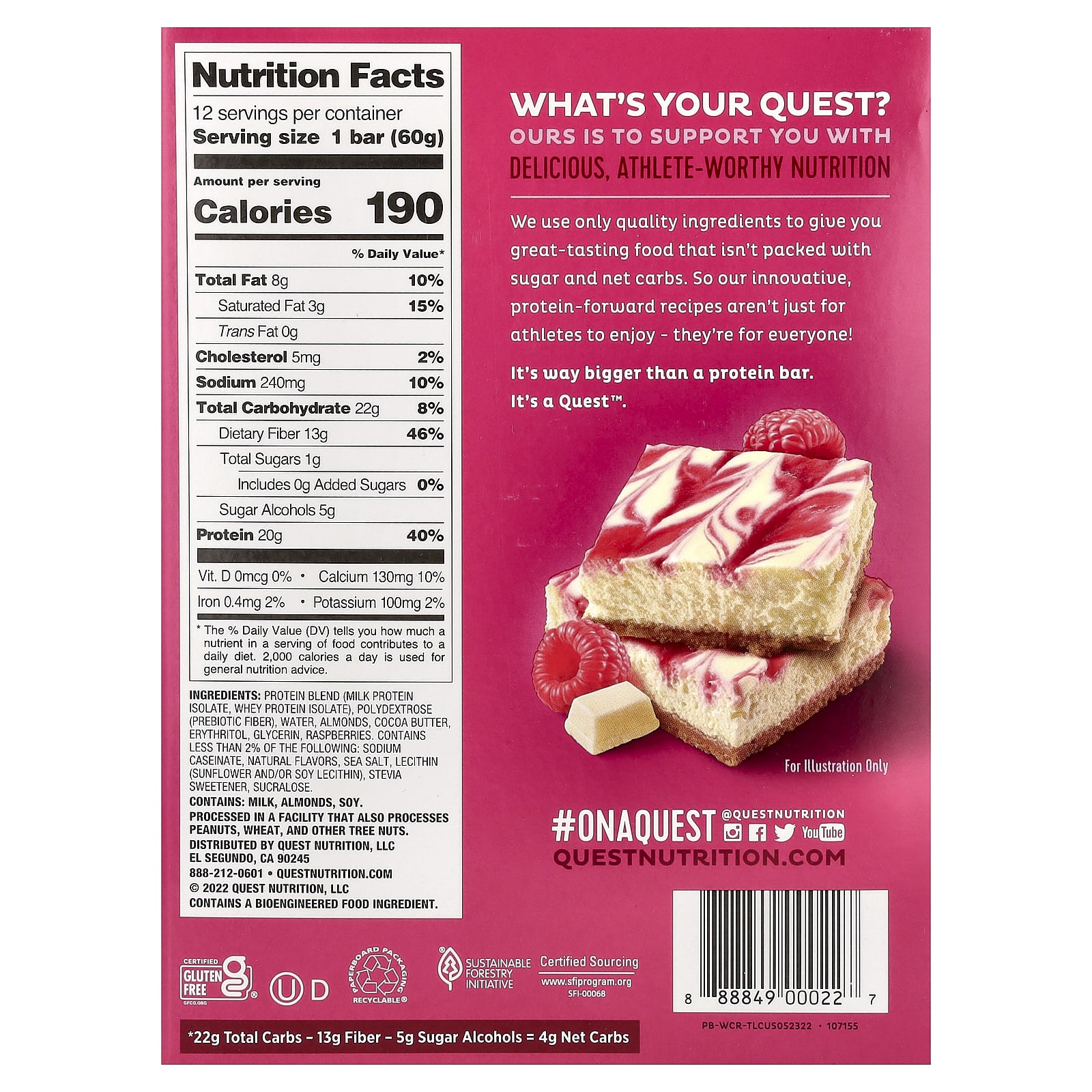 Quest Nutrition Barra de Proteínas Framboesa e Chocolate Branco 12 Barras 60 g (212 oz) Cada – Quest Nutrition Nutrição Esportiva Barrinhas e snacks esportivos Barras de Proteína Barras de Proteína de Whey.
