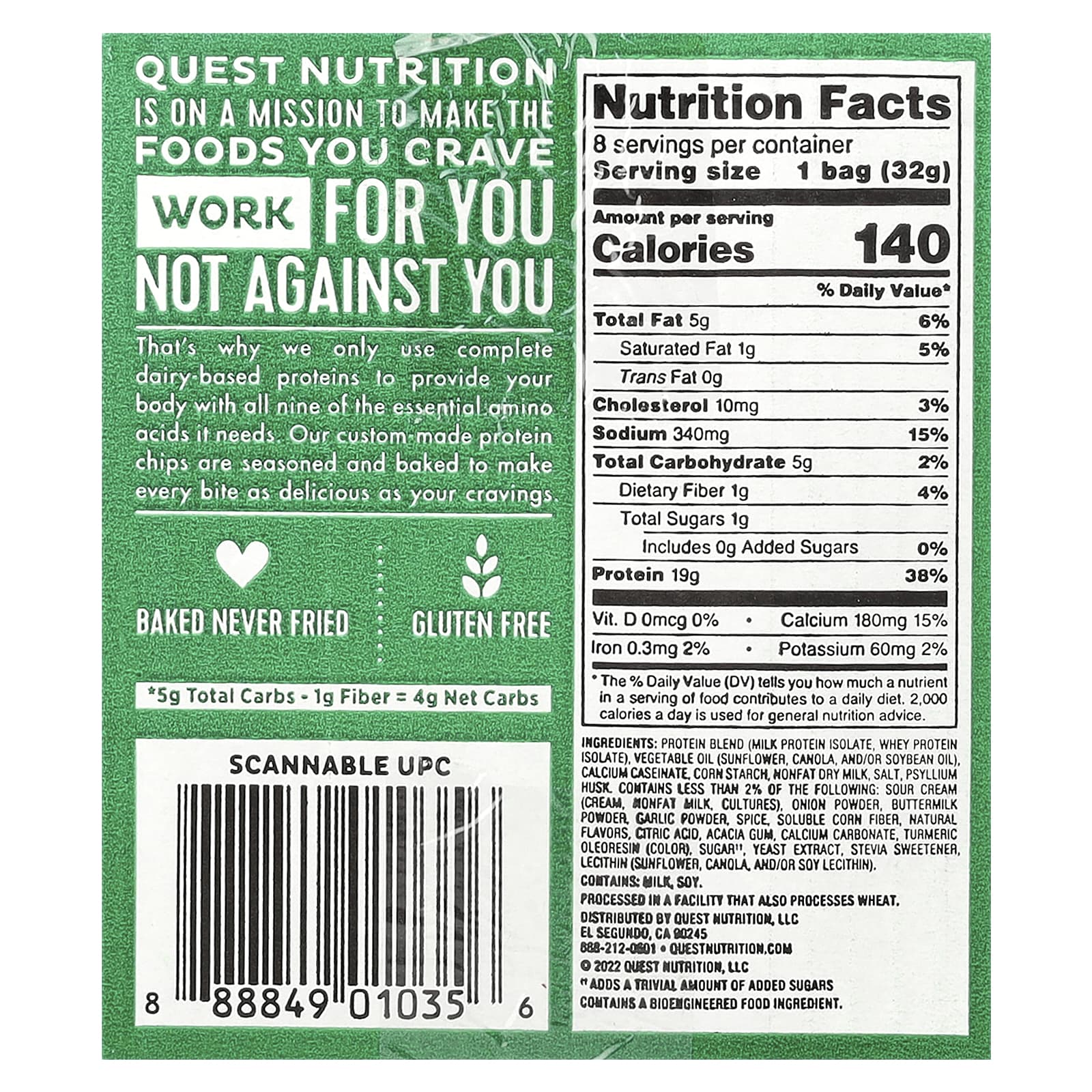 Mistura de proteínas (isolado de proteína do leite, isolado de whey protein), óleo vegetal (girassol, canola, e/ou óleo de soja), caseinato de cálcio, amido de milho, leite desidratado sem gordura (desnatado), sal, casca de psílio. Contém menos de 2% do seguinte: sour cream (creme, leite desnatado, culturas), cebola em pó, leitelho em pó, alho em pó, especiaria, fibra de milho solúvel, sabores naturais, ácido cítrico, goma acácia, carbonato de cálcio, oleorresina de cúrcuma (corante), açúcar††, extrato de levedura, adoçante de estévia, lecitina (girassol, canola, e/ou lecitina de soja).