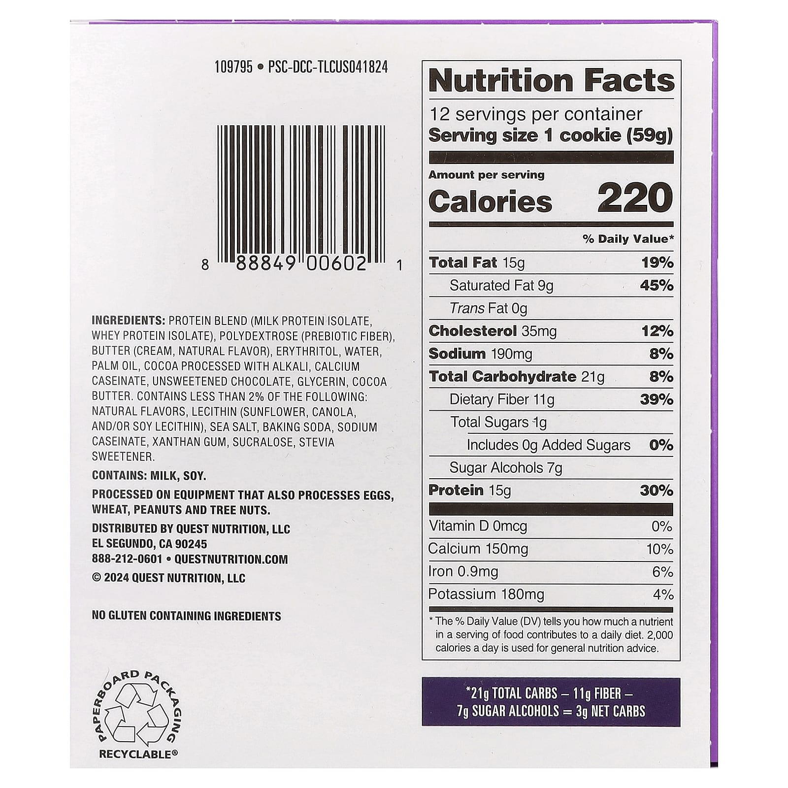 Mistura de proteínas (isolado de proteína do leite, isolado de whey protein), polidextrose (fibra prebiótica), manteiga (creme, sabor natural), eritritol, água, óleo de palma, cacau processado com álcali, caseinato de cálcio, chocolate não adoçado, glicerina, manteiga de cacau. contém menos de 2% do seguinte: sabores naturais, lecitina (girassol, canola, e/ou lecitina de soja), sal marinho, bicarbonato de sódio, caseinato de sódio, goma xantana, sucralose, adoçante estévia.