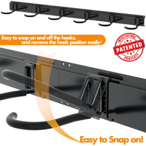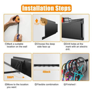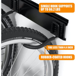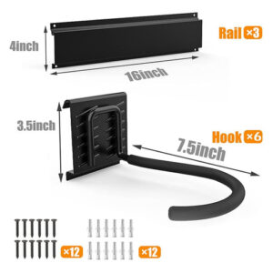 ABOUT TORACK TORACK is a manufacturer specializing in bike storage tools, hooks, racks, hangers and other home improvement tools for garage, basement, utility room or shed. We specilizing in creating systems to manage everything in order for space saving and stuffs storage. With TORACK Bike Rack, you can easily mount all your bikes on the wall, which also makes a beautiful scene. Heavy duty bike hooks fits for most of the bicycles, like mountain bikes, road bikes, bmx bikes, kids bikes etc. The hooks on top have got rubber covered, which will protect the tire of your bike from scratching or slipping. SPECIFICATIONS Material: Powder-coated Finish Rails & Rubber-coated Sleeves Hooks Weight Capacity: 600Ibs/272KG Feature: Anti-Scratch Rubber Hook Pack Included 3 x 16 Bike Rack Rails 6 x Bike Hooks 16 x Metal Screws 16 x Wall Anchors – CUSTOMIZED BIKE STORAGE SOLUTIONS- Pretty rail interlock design, seamlessly combine rails. 16-inch * 3-pack rails & 6 hooks can be separated or interlocked wall mounted to display or hang your bike. TORACKs snap hook design makes it easy to snap on the rails and adjust the hook spacing. – WALL-MOUNTED SPACE-SAVING- Bike wall racks for garage organizers get your bikes off the floor and make it easy to organize and clean your home and garage. Wall-mounted 6 bike rack saves space effectively. – WIDE SIZE HOOKS for BIKE HANGER- Hang up to 4.4-inch fat bike tires. Suitable for mountain bikes, road bikes, folding bikes, hybrid bikes, adult bikes, and kids bikes, scooters, etc. Wide size hooks make hanging up and taking down your bike an easy task. – DURABLE MATERIAL- Powder-coated rails & rubber-coated sleeves. Excellent durability with anti-rust, anti-crack, anti-scratch, and anti-slip functions. Heavy-gauge steel construction provides safety loading up to 400lbs. Certified by GS. Safety Guaranteed. – EASY TO INSTALL- All you need is an electric drill, and perhaps a level to ensure that it is lined up in a row for mounting on the studs on the wall. WALL STUDS SPACING: 16 INCHES! Install to drywall or other paneled wall sheeting, must be located to solid structures. (Includes all installation hardware.)
