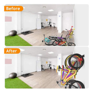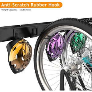 O rack para 6 bicicletas e 5 capacetes para organizador de garagem mantém suas bicicletas fora do chão para facilitar a organização e limpeza da garagem. Ganchos estáveis (design patenteado nos EUA) tornam fácil pendurar e derrubar bicicletas. Racks montados na parede, ideais para economizar espaço interno.