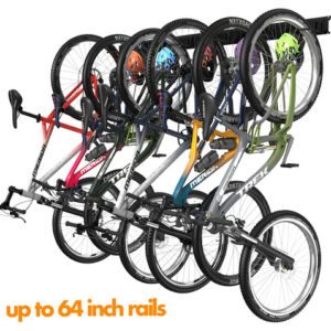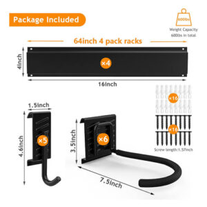 EXTRA LONGOS DE 64 POLEGADAS – trilhos de 16 polegadas* 4 pacotes montados perfeitamente. Os bicicletários TORACK tiram suas bicicletas do chão e facilitam a organização e a limpeza de sua garagem. 6 bicicletários montados na parede e 5 ganchos para capacete economizam espaço de forma eficaz.