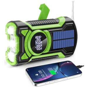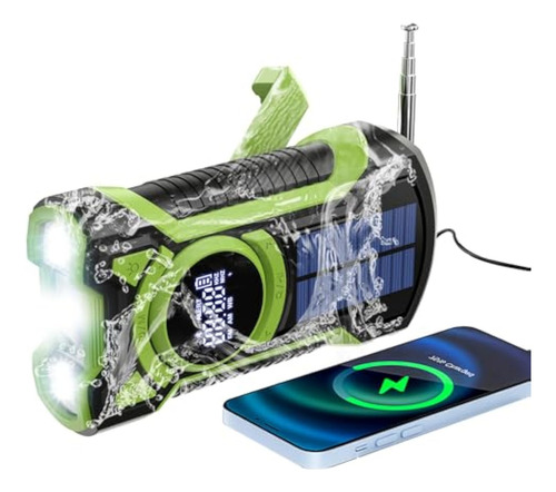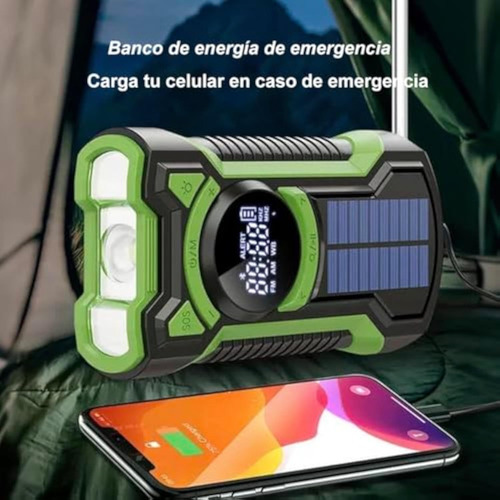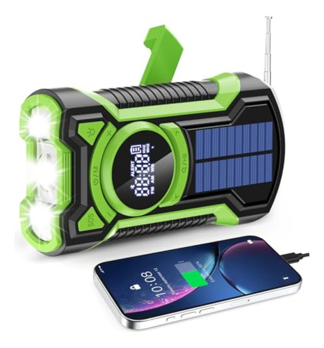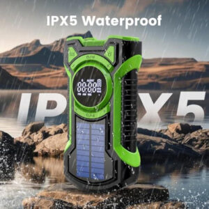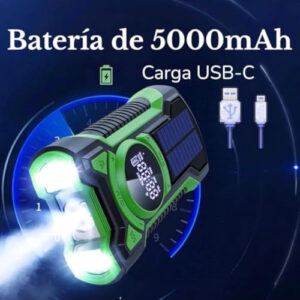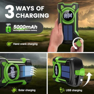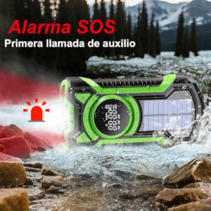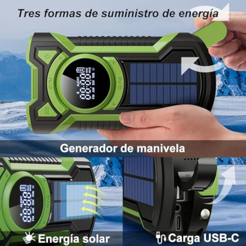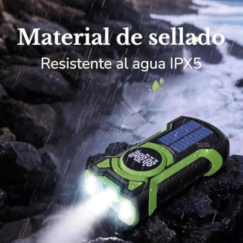 A bateria de emergência externa integrada de 5000 mAh, compatível com carregamento solar triplo, manivela e USB-C, fornece energia de emergência para telefones celulares e outros dispositivos.