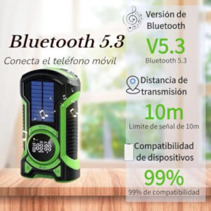 conectividade Bluetooth 5.3 de baixa latência (alcance de transmissão de 9 metros) para streaming de música, audiolivros ou como centro de transmissão de emergência; podcasts de sobrevivência pré-gravados por profissionais são recomendados e podem ser combinados com uma bateria externa para aprendizado off-line.