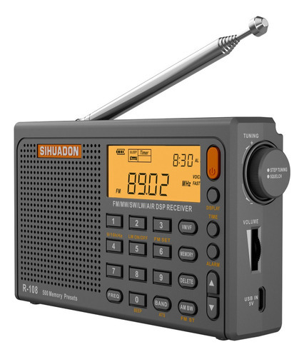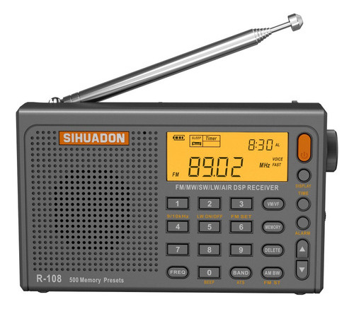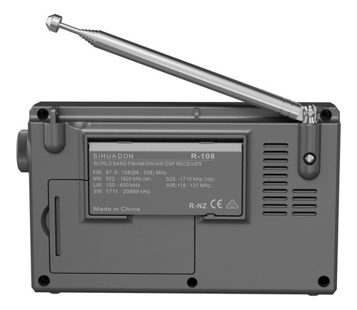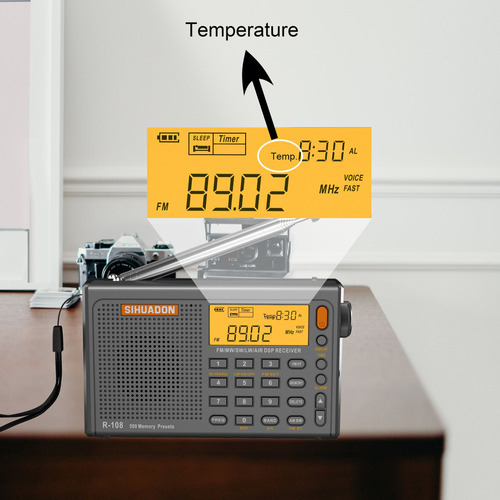 500 memórias predefinidas. 100 memórias predefinidas para cada banda FM, MW, LW, SW e AIR. O R-108 possui um display LCD retroiluminado, que é conveniente para uso noturno. A saída AUX do R-108 pode ser usada com fones de ouvido ou alto-falantes externos.