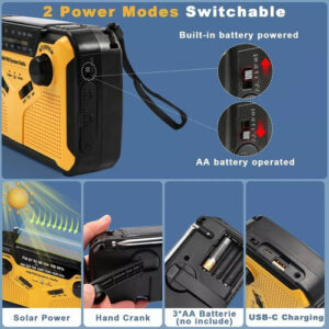 4 formas de carregamento Este rádio de emergência tem 4 formas de carregamento: carregamento USB, manivela, energia solar, pilhas AAA (não incluídas). Tenha diferentes opções de fonte de alimentação em diferentes circunstâncias.
