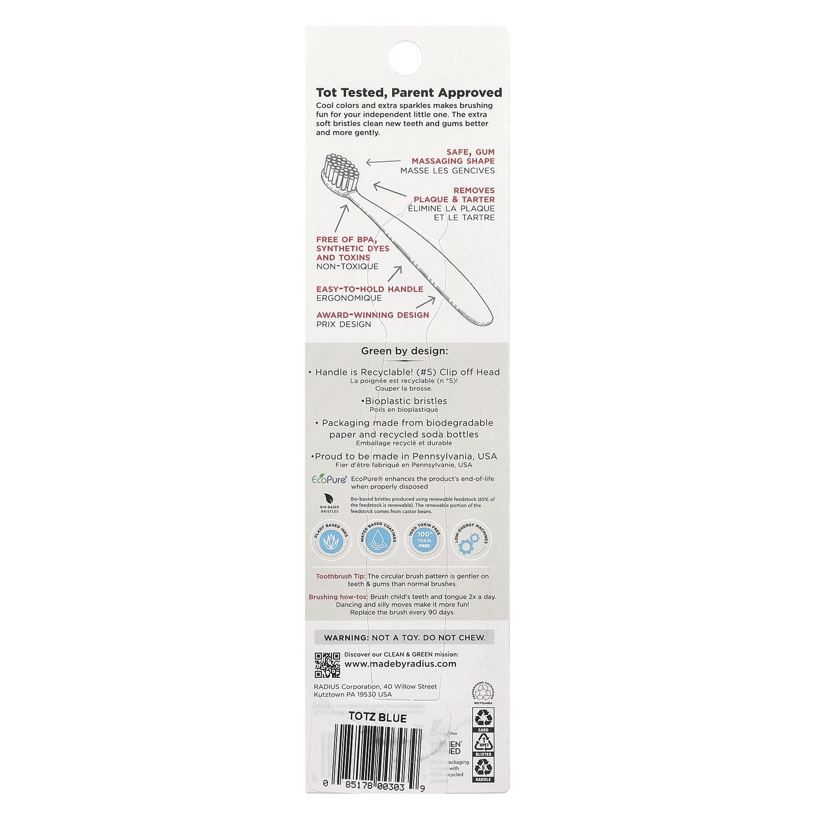 RADIUS Escova de Dentes Totz® Acima de 18 Meses Extramacia Azul Claro Brilhante 1 Escova de Dentes – RADIUS Bebês e Crianças Higiene Bucal Escovas de Dente para Bebês e Crianças.