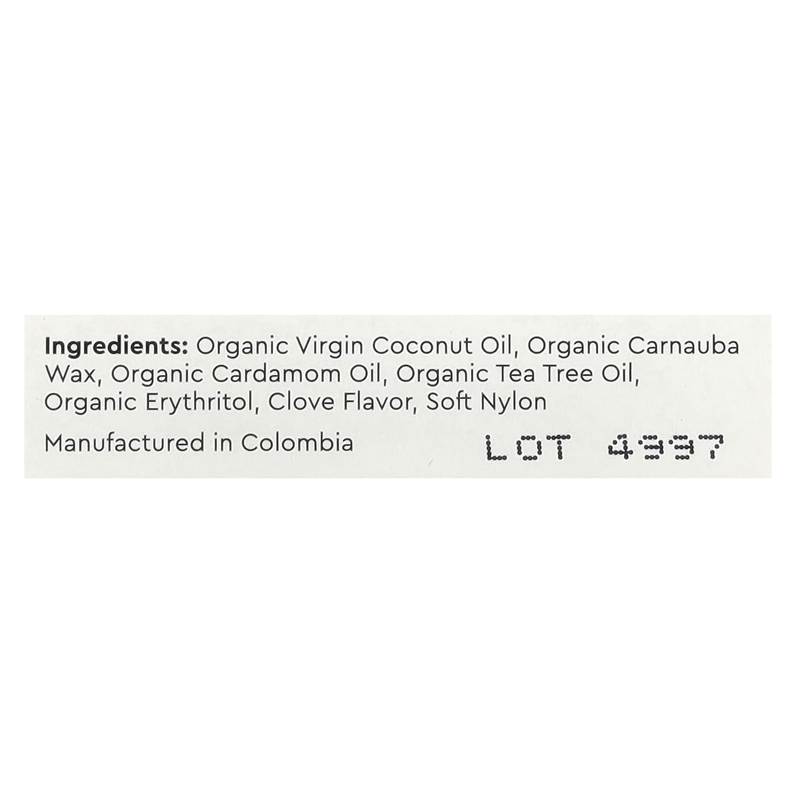 Óleo de coco virgem orgânico, cera de carnaúba orgânica, Vagem de Cardamomo Orgânico, Óleo de melaleuca orgânico, eritritol orgânico, sabor cravo, náilon macio.