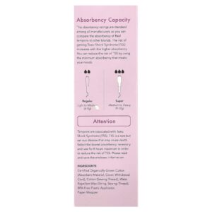 Algodão cultivado organicamente certificado (Material absorvente, cobrir, fio de segurança), algodão (linha de costura), cera hidrorrepelente (corda, linha de costura), aplicador de plástico sem bpa, invólucro de papel.