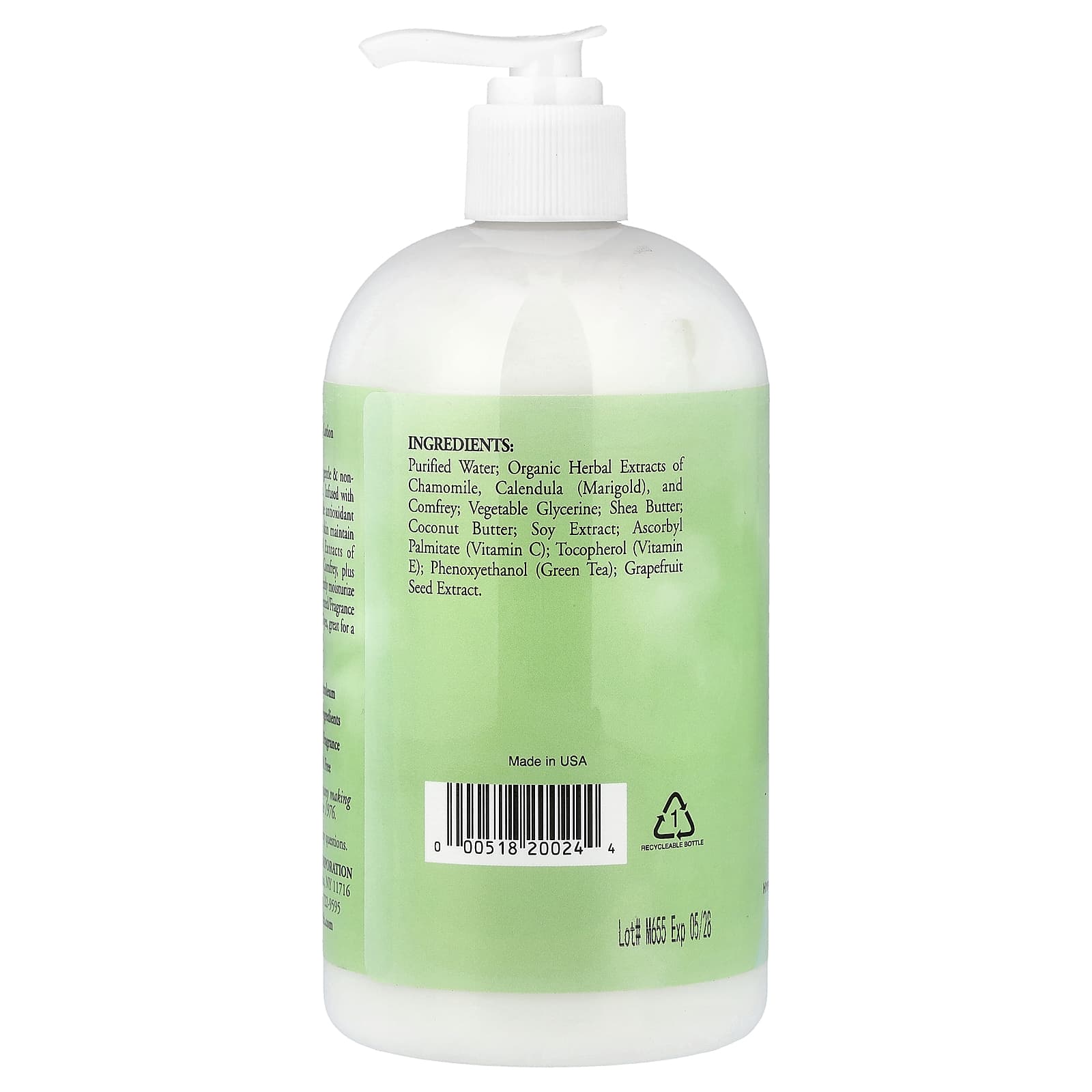 Água purificada; extratos de ervas orgânicas de camomila, calêndula (calêndula), e confrei; glicerina vegetal, manteiga de karité; manteiga de coco; extrato de soja; palmitato de ascorbila (vitamina C); tocoferol (vitamina E); fenoxietanol (chá verde); extrato da semente de toranja.