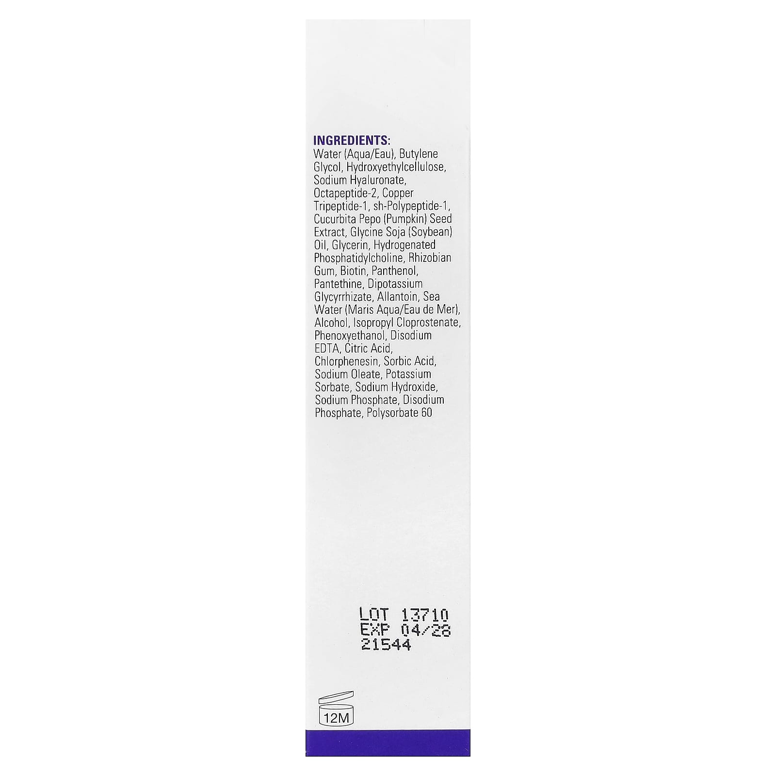 Água, butilenoglicol, hietelose, hialuronato de sódio, octapeptídeo-2, tripeptídeo-1 de cobre, sh-polypeptide-1, extrato da semente de Cucurbita pepo (abóbora), Óleo de Glicina de Soja, Glicerina, fosfatidilcolina hidrogenada, goma de rizóbio, biotina, pantenol, pantetina, glicirrizato dipotássico, alantoína, água do mar (Maris aqua/eau de mer), álcool, cloprostenato de isopropila, fenoxietanol, EDTA dissódico, ácido cítrico, clorfenesina, ácido sórbico, oleato de sódio, Sorbato de potássio, hidróxido de sódio, fosfato de sódio, fosfato dissódico, polissorbato 60.