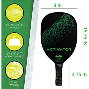 A raquete Franklin Sports Activator é a combinação perfeita de jogabilidade e funcionalidade. O design de madeira de 7 camadas cria uma base sólida para jogos de alto nível. As alças têm aderência e acolchoamento superiores para jogos competitivos, ao mesmo tempo que permitem ao jogador um conforto superior. Cada pá foi projetada com bordas de plástico para maximizar a vida útil das pás.
