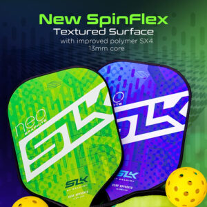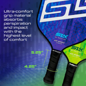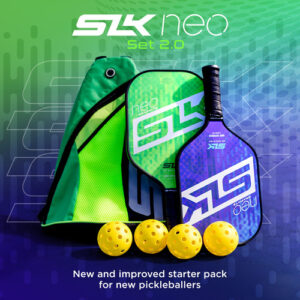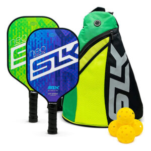 2024 SLK by Selkirk Pickleball Paddles Featuring a Multilayer Fiberglass and Graphite Pickleball Paddle Face SX3 Honeycomb Core Pickleball Rackets Designed in The USA for Traction and Stability – MULTILAYER FACE TECHNOLOGY Created by the pioneers of todays Pickleball paddle technology, SLK by Selkirk combines the latest developments in paddle technology with comfort, balance, and affordability. SLK Neo features a multilayer face that combines the power of Graphite with the control of Fiberglass. This revolutionary technology has been trusted and developed by the pros to help elevate your game for both indoor and outdoor performance. – SX3 HONEYCOMB CORE Designed using exclusive honeycomb core technology. SLK Pickleball paddles yield a large sweet spot for constant speed while absorbing the hit and softening the feel. – LIGHTWEIGHT PICKLEBALL PADDLES Only 7.5OZ for each paddle, these pickleball racquets are beautifully balanced between lightweight paddles and medium weight paddles. Perfect for the next generation of Pickleball players. – ULTRA CUSHION GRIP Combined with 4.25 grip circumference and 5.25 length. SLK Pickleball paddles use Ultra-Comfort Grip material, designed for the highest level of comfort absorbing both perspiration and impacts as they travel from the paddle face to the hand, allowing you to play without fatigue after long gameplay intervals. – SLK PADDLE SET Get the ultimate starter pickleball set! The SLK Neo paddles incorporate the same research and pedigree that go into all Selkirk paddles, but at a more affordable price. This pickle ball racquette set of 2 contains both Red and Blue SLK Neo pickle ball paddles, 4 indoor and outdoor pickleball balls and a rigid carry bag to protect your paddles, when youre on the go.