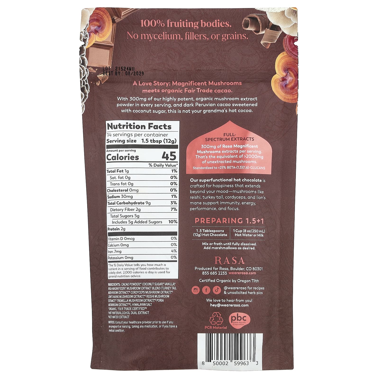 Cacau em pó*†, açúcar de coco*, baunilha; mistura magnífica de extrato de cogumelos Rasa (extrato de cogumelo cauda-de-peru*§, extrato de cogumelo Cordyceps*‡, extrato de cogumelo juba-de-leão*‡, extrato de cogumelo Reishi*‡, extrato de cogumelo Tremella*§, extrato de cogumelo Poria*§), sal do himalaia.
