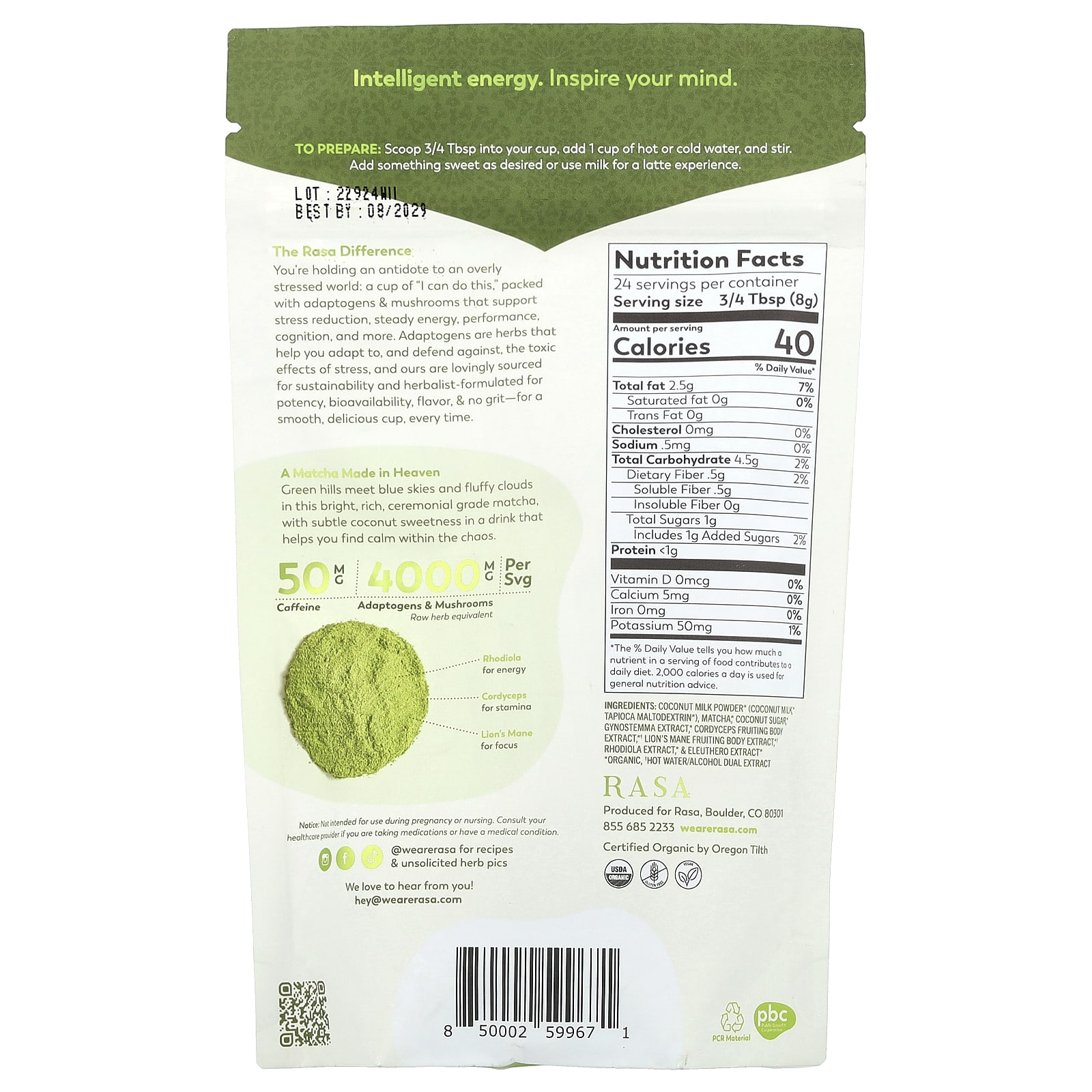 Leite de coco em pó* (leite de coco*, maltodextrina de tapioca*), matcha; açúcar de coco*, extrato de gynostemma*, extrato do corpo de frutificação de Cordyceps*†, extrato do corpo de frutificação de juba-de-leão*†, extrato de rhodiola*, & extrato de eleutero*.