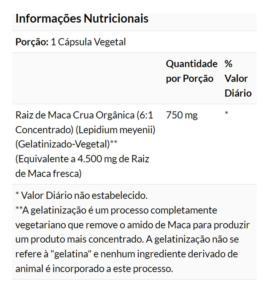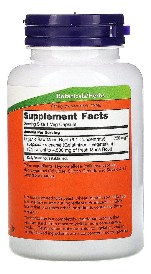 Now Foods Raw Maca Peruana 750mg 90 Cápsulas Vegetarianas Fórmula mais Concentrada Suporte a Libido Vigor Físico e Energia / Importado-TOPSHOP Disponível em uma fórmula de 750mg e em cápsulas vegetarianas que podem ser facilmente ingeridas, a Maca Peruana da Now Foods apresenta uma forma mais concentrada e crua desta substância que pode ajudar a promover maior libido e desempenho sexual, vigor físico ou mesmo complementar sua dieta alimentar como uma substância importante e tônico energético geral. Outros ingredientes: Hipromelose (cápsulas de celulose), celulose hidroxipropulsora, dióxido de silício e ácido esteárico (fonte vegetal). Recomendações de uso: Tome 1 a 2 cápsula por dia. Cuidados: Apenas para adultos. Pode ocorrer variação de cor natural neste produto. Mantenha fora do alcance de crianças. Armazenamento: Armazenar em local seco e fresco após a abertura. Podem ocorrer variações naturais de cor neste produto. Dimensões: 11,0 x 6,0 x 6,0 cm Peso: 0,126 1x Frasco com 90 Veg Caps VALIDADE LONGA.