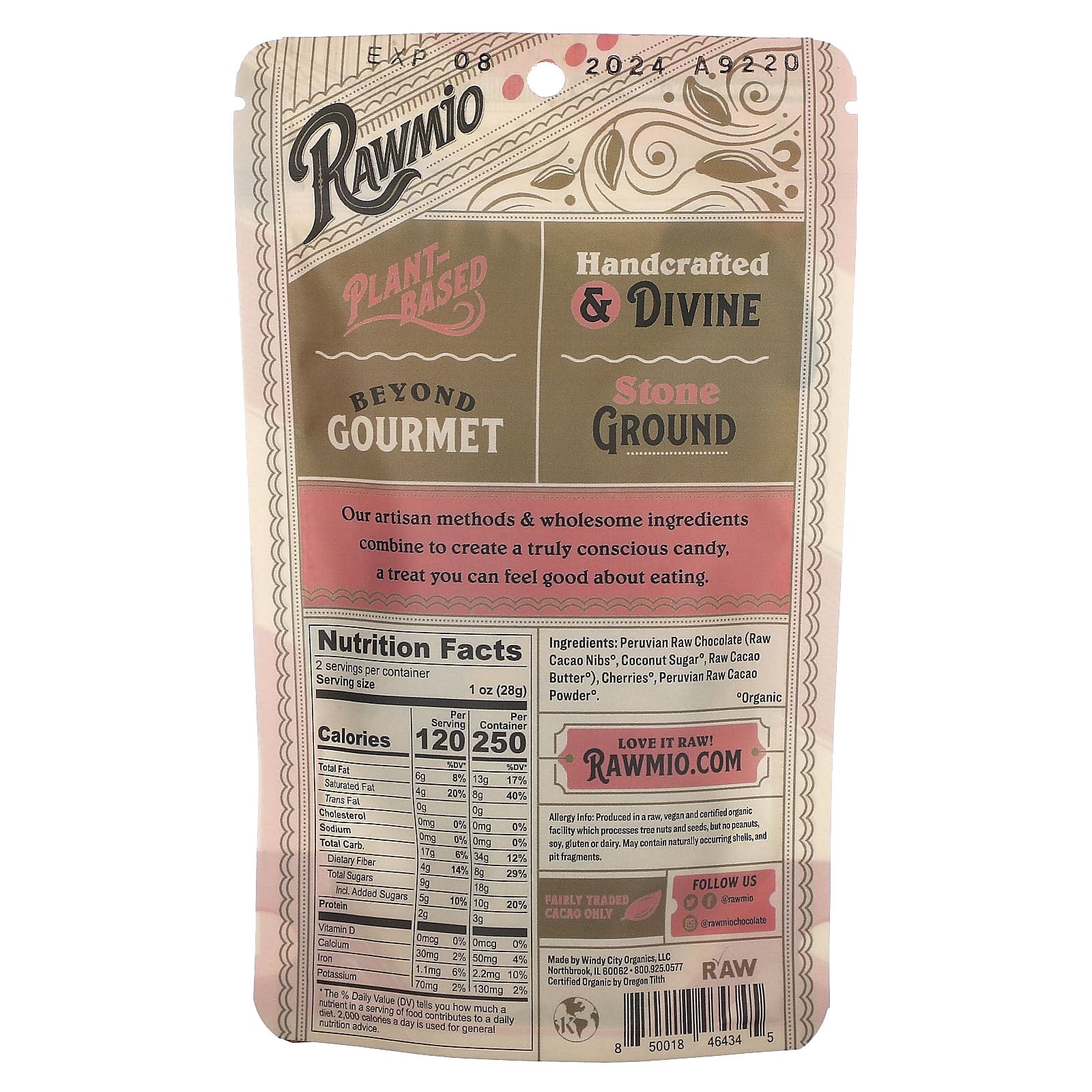 Chocolate peruano cru (nibsº de cacau cru, açúcar de cocoº, manteiga de cacau cruaº), cerejasº, cacau cru peruano em póº.