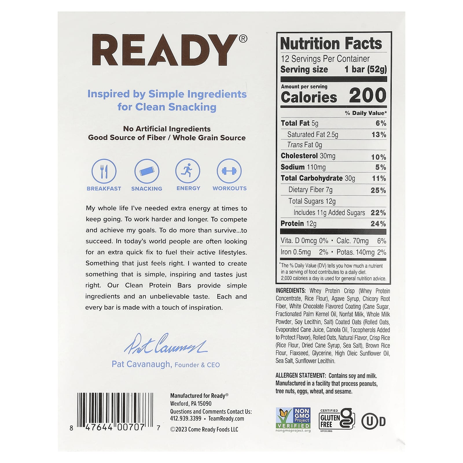 Proteína whey crisp (concentrado de proteína whey, farinha de arroz), xarope de agave, fibra da raiz de chicória, cobertura com sabor de chocolate branco (açúcar de cana, óleo da semente de palma fracionado, leite desnatado, leite em pó integral, lecitina de soja, sal) aveia em flocos (aveias em flocos, suco de cana evaporado, óleo de canola, tocoferóis adicionados para proteger o sabor), aveia em flocos, sabor natural, arroz crocante (farinha de arroz, xarope de cana desidratado, sal marinho), farinha de arroz integral, linhaça, glicerina, óleo de girassol com alto teor oleico, sal marinho, lecitina de girassol.