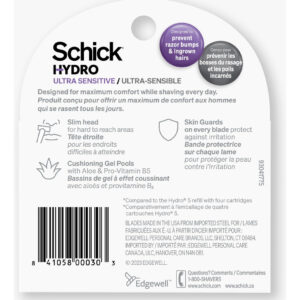 Recargas de barbear ultrassensíveis Schick Hydro, 5 quilates | Recargas de lâminas de barbear, lâminas de barbear para homens, recarga de lâminas de barbear Hydro, 3 cabeças de barbear, 5 recargas — DIGA NÃO AOS SOLAVANCOS As recargas de barbear ultrassensíveis Schick Hydro são projetadas especificamente para evitar inchaços e pelos encravados. – PROTEÇÃO PARA VOCÊ CAN FEEL Projetado com revestimento confortável para facilitar o deslizamento e barbear com precisão, com protetores de pele em cada lâmina que protegem contra irritações. – Máximo conforto Testado por dermatologistas, nossas recargas de barbear de 3 lâminas têm 7 piscinas de gel de amortecimento, enriquecidas com Aloe e pró-vitamina B5, que hidratam e suavizam a pele para o máximo conforto enquanto você se barbeia. – ÓTIMO VALOR Desfrute de um barbear apertado e confortável neste formato acessível e econômico de carteira*. *Em comparação com a recarga Hydro 5 com quatro cartuchos. – LÂMINAS DE LONGA DURAÇÃO Utilizando nossas lâminas mais duráveis para um barbear preciso e duradouro, esses 5 cartuchos de recarga Schick Hydro proporcionam até 90 barbeações por pacote**. **Com base em uma média de 18 barbeações por cartucho. – ESTEJA NO CONTROLE Esta máquina de barbear tem um design de cartucho Slim Head que facilita o barbear em locais apertados e de difícil acesso, como na área diretamente abaixo do nariz.